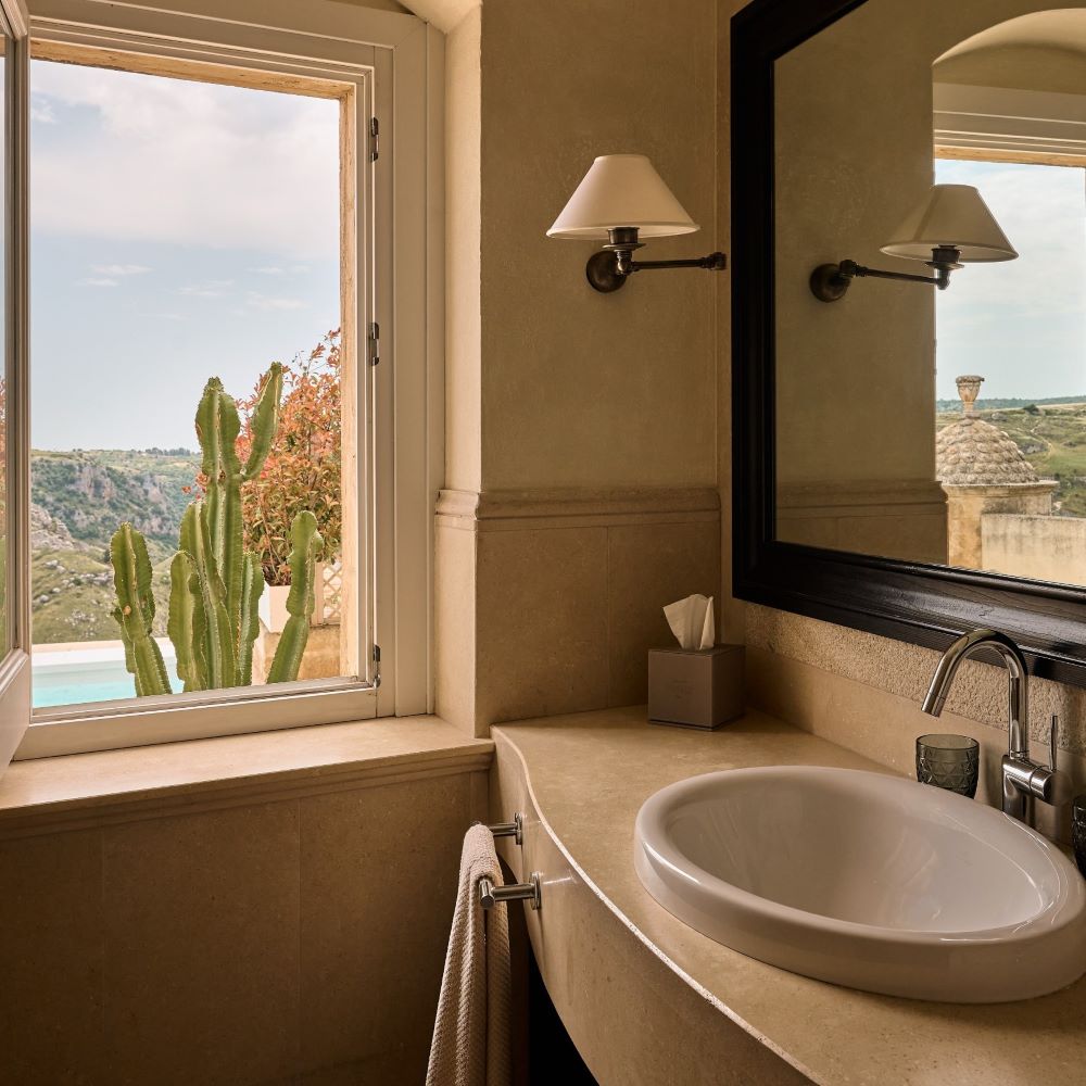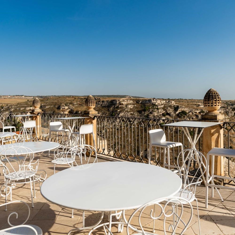 Dining options include the Le Bubbole restaurant, open from breakfast through dinner, a lively wine bar, and, in summer, a panoramic terrace overlooking Piazza San Pietro Caveoso and the Murgia Materana.