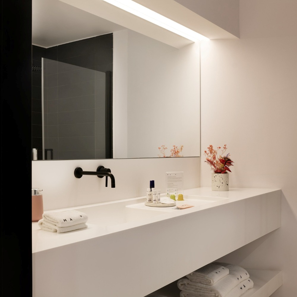 The building itself is a bold contemporary statement by local architects EKKY Studio, and contrasts vividly with the historical architecture on display elsewhere in Nicosia’s old city center. And the interiors are just as daring; mostly monochrome, with faint echoes of Bauhaus or Art Deco, they’re truly unique, a vision of the future embellished with splashes of pink and magenta and vivid contemporary artworks.