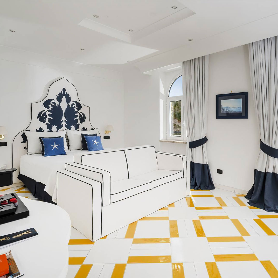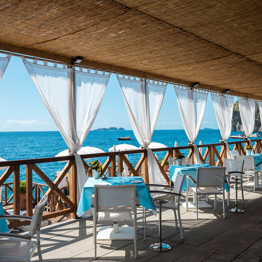 The accommodations are crisply decorated in blues and whites, and at all levels, from the humblest Classic to the top-end Alma Suite, they’re outfitted with luxury-hotel details, both high-tech and low. The Alma Spa comes with jaw-dropping views of its own, as does the outdoor pool; an Amalfi-style beach with a sun deck, loungers, and a bar is a short elevator ride away. Another bar serves the pool area, and the Hall Bar is the more elegant indoor venue; the beachside Remmese restaurant is the casual counterpart to the gourmet La Serra.