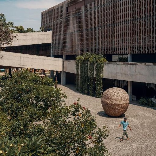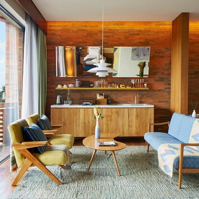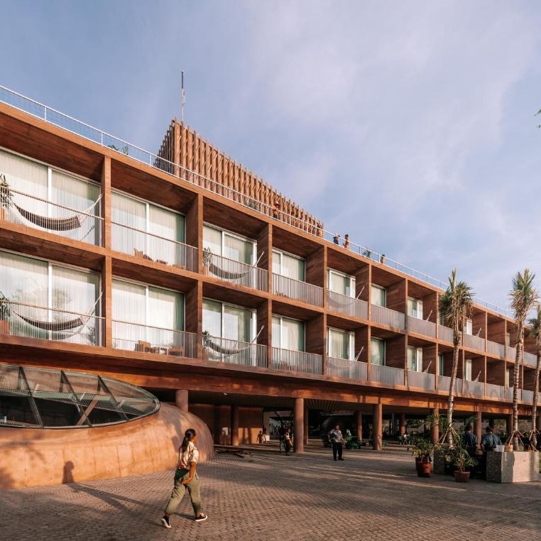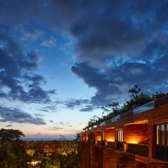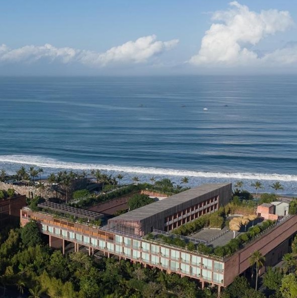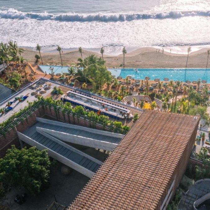 Most people’s vision of a Balinese hotel doesn’t involve a modern red-brick structure that soars higher than the tree line. But as you might guess from the name, Potato Head Suites & Studios is not a typical Balinese hotel. More than just a hotel, Desa Potato Head is a “creative village” that also serves as a gathering and events space for the local community, designed by architect Rem Koolhaas’s OMA.