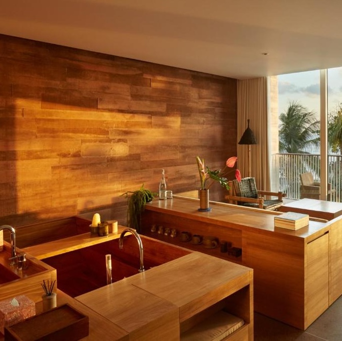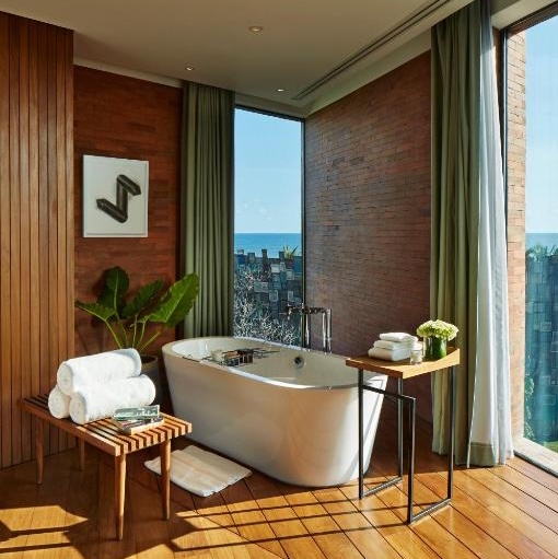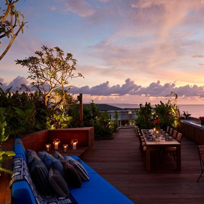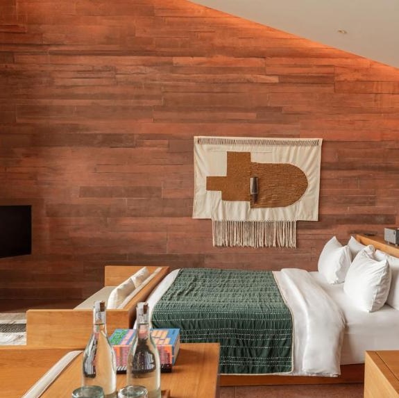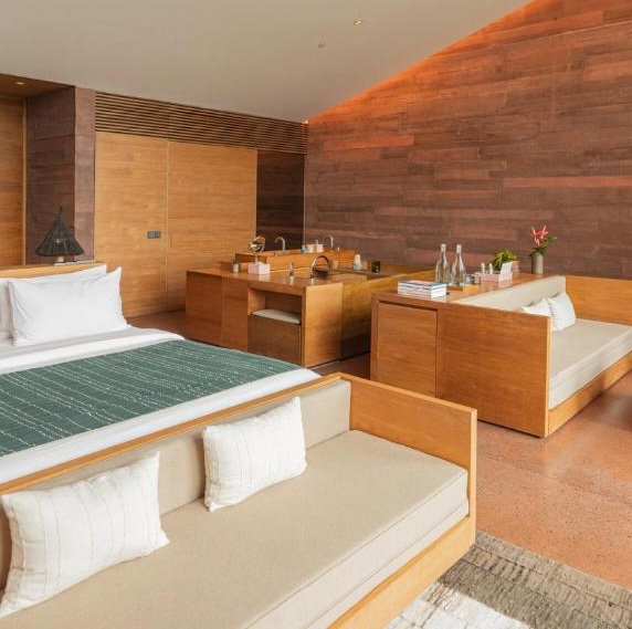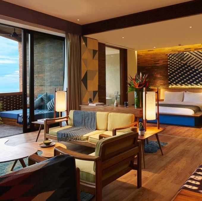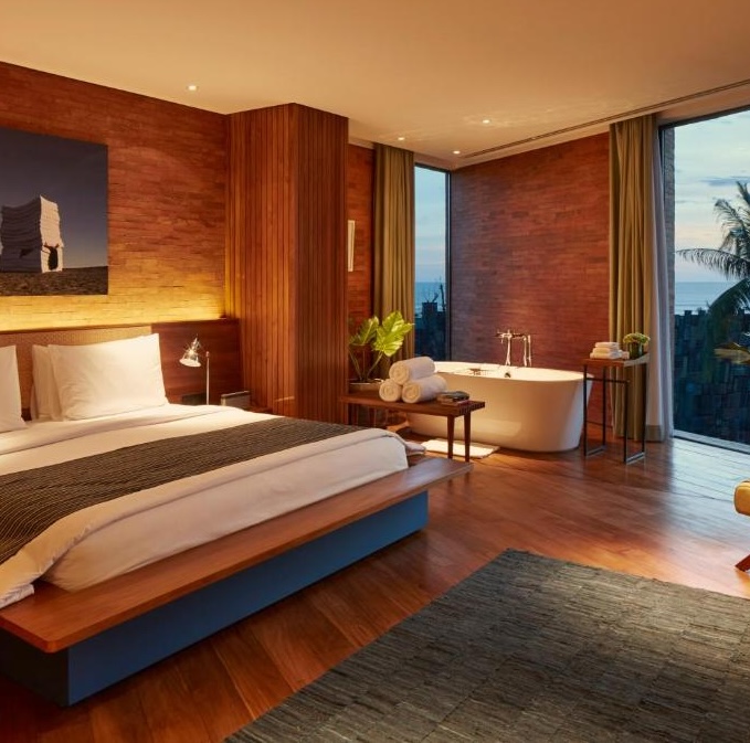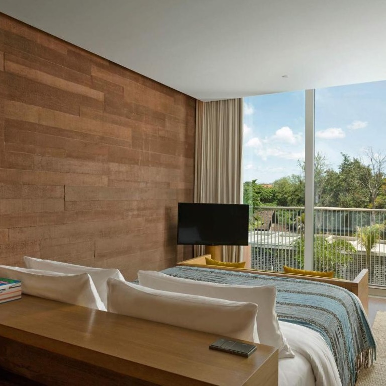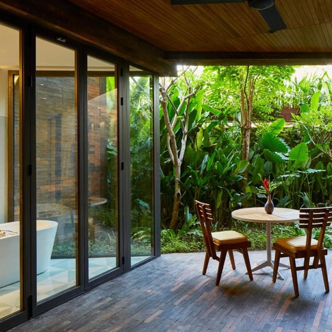This explains the architecture, which finds a fertile middle ground between neo-Brutalism and Indonesian tradition. It also explains such interior-design flourishes as Le Corbusier’s Thonet No. B9 Chair, the Pendant lamp ph5 1958 by Louis Poulsen and the Lampe Gras 1921 by Bernard- Albin Gras. Situated in separate wings, the Suites are the high-end option, while the Studios come in at a more attainable price point, though there’s considerable overlap between the two ranges. All of them feature king beds and custom-made organic bath products, and all are cut from the same crisp and contemporary stylistic cloth.