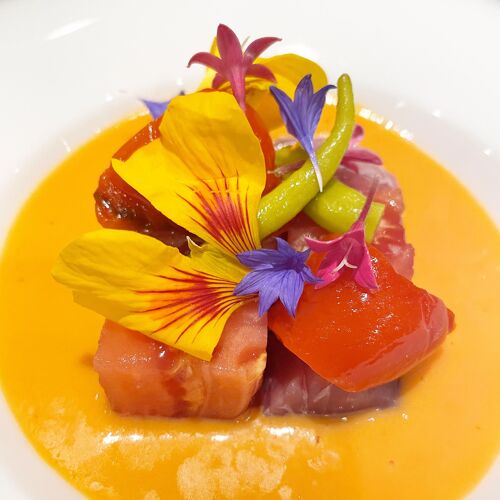 ‘Basque cuisine you can taste only at Alarde’ is the theme, as the chef matches recipes studied in the Basque Country to ingredients found in Japan. His passion shines in the wagyu beef cooked in a stone oven. Fire is built from charcoal and firewood, then grapevines are added to wreathe the beef in smoky aromas. While you’re waiting for the meat to cook, treat yourself to some pinchos or mixed rice. Experience the world of Basque food culture.
