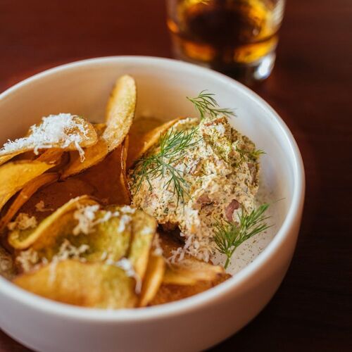 Blue plaid carpets, antler sconces and wood tables with roughhewn branch bases set a rustic tone in this restaurant set on the second level of RT Lodge. It's cozy and charming, a perfect base for Chef Trevor Stockton's American menu. If you're dining à deux, opt for the tasting menu with trout dip, chicken and seasonal cobbler, while most guests will select from a tempting array on the à la carte menu. A house-made hash brown is fried to a crisp, set with horseradish cream and finished with shaved horseradish and trout roe for a positively decadent delight, then North Carolina rainbow trout is grilled with a black pepper rub and sided by roasted potatoes, charred spring onion and a white barbecue sauce for a bold and comforting dish. Craving something sweet? Order the Pavlova or the seasonal cobbler sized for two.