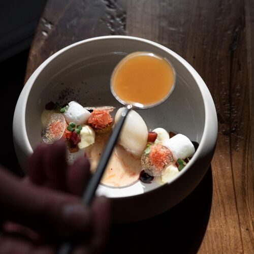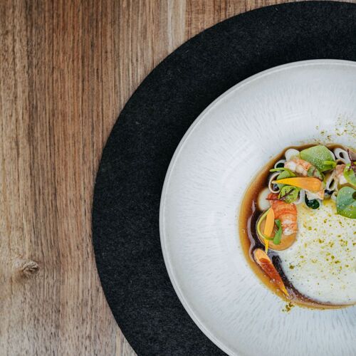 Benoît Vidal is the Catalan chef behind this restaurant done out in a slick contemporary style in the Annecy area. Having completed stints with Michel Trama and Michel Guérard, he has created a light, poetic brand of cuisine that is rooted in the culinary traditions of Savoie, his adopted home. He brings a sense of precision and his own personal style to bear on the rigorously sourced ingredients, elevating them with sound technical skill and elaborate presentations. The strength of this chef may well lie in his pared-down, apparently simple creations showcasing pike, trout and crayfish with understated elegance. Appealing vegetarian set menu ("Sentier à fleur d'eau") and wallet-friendly lunch menu.