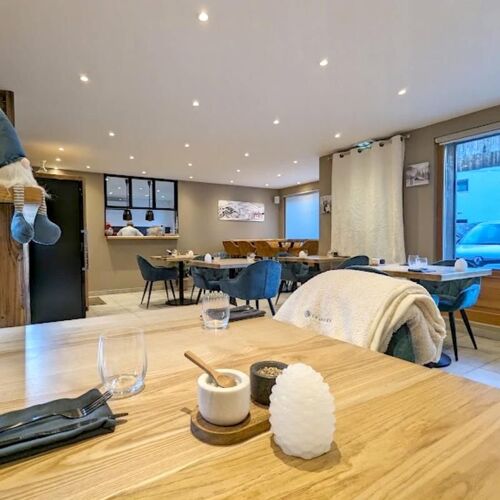 This restaurant is run by a young couple who are passionate about what they do: chef Flavio Ricco and Lola Goudenove. In the heart of the village it has a cosy dining area done out in the style of a lodge. The blend of wood and stone makes for a relaxing feel. The chef prepares traditional cuisine with a measure of creativity, highlighting local ingredients on a set menu (with options). This lunchtime, the chef demonstrated his finesse when revisiting soupe châtrée – a rather hearty Samoëns speciality made with bread, Tomme de Savoie cheese and onion soup, that was followed by a fillet of sea bass with celery and beurre blanc with Génépi. For dessert, there was candied apple, vanilla cream and vanilla ice cream. The welcome and service are charming: in fact, the chef comes out of his kitchen from time to time to serve his guests.
