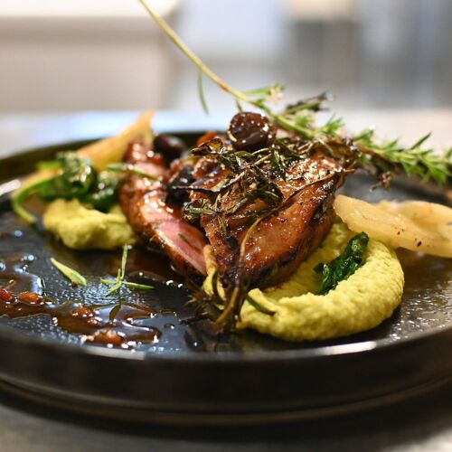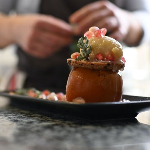 Chef Cédric Denaux works his magic in this elegant Directoire château (1835), whose terrace overlooks the Bourbon countryside. His creative and seasonal cooking prominently features plant-based and of course seasonal ingredients. He uses home-grown aromatic herbs, plants and vegetables from the château garden, paired with top-drawer ingredients. The memory of his Roscoff monkfish, dashi stock, marigold petals and purple basil lingers with us still.