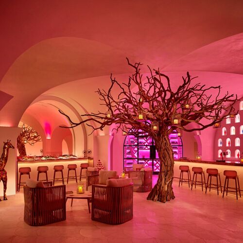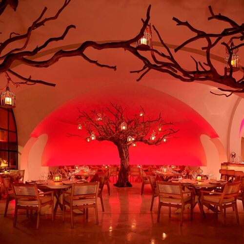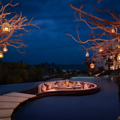 Located within Rosewood's Las Ventanas al Paraiso, this beguiling setting hosts diners in an indoor/outdoor space arranged with chunky blond wood tables on a polished stone patio. Lantern-hung branches cast a rosy glow.