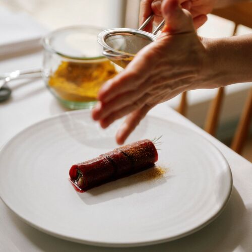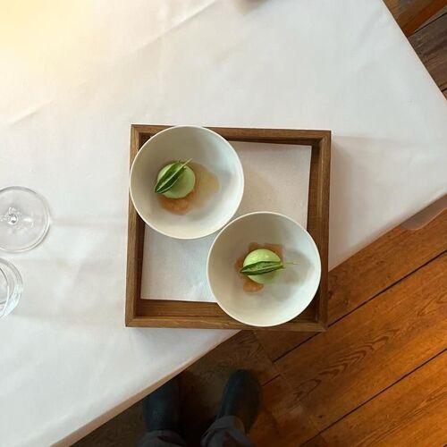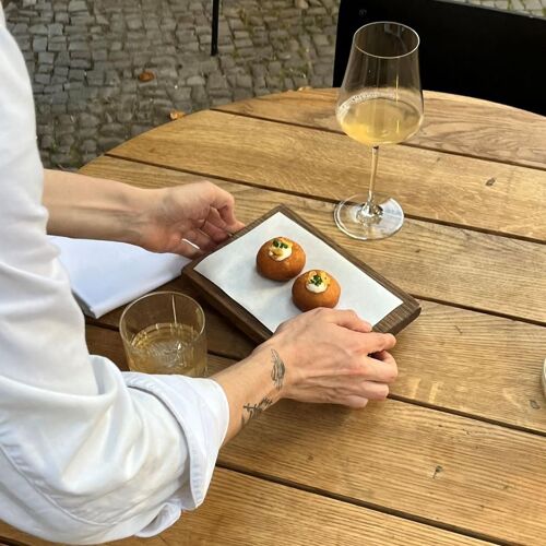 This restaurant is located on Böhmischer Platz, which is a lively little square – the hustle and bustle makes the pavement terrace a popular spot in summer. The interior also has its charm: distinctive whitewashed brick walls, attractive floorboards and modern design elements create a charming, almost minimalist urban interior. This is matched by the modern, straightforward and often pared-back cuisine made predominantly from regional ingredients, for example the mashed potatoes with lovage and whey foam. Chef Sarah Hallmann (she is also the source of culinary ideas and, as the proprietor, provides cordial and professional service) and sous-chef Rosa Beutelspacher complement each other beautifully in this remarkable partnership.