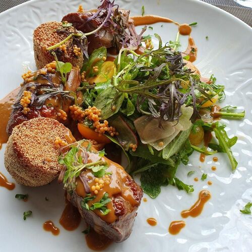 The secret behind the Zest’s success is market-fresh cooking, original recipes dusted with exotic notes, spices and seasonings, a delightfully friendly vibe and in summertime, a riverside patio on the banks of the Vilaine. Slick service with a smile.
