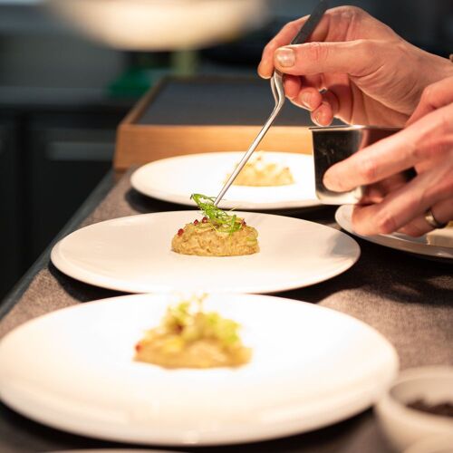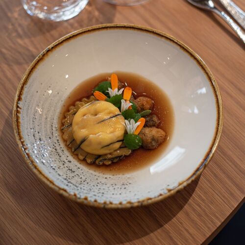 In the heart of the city, a couple of young industry professionals have set up this restaurant with a warm, elegant decor that has been thought out down to the last detail (eg mosaics, tapestries inspired by drawings of the chef's dishes, and bespoke furniture). Cuttlefish ravioli, Noilly Prat, wild garlic and morels; turbot, peas and an astonishing koji yoghurt sauce: chef Alexandre Juton also draws inspiration from the season to concoct appealing dishes that are testament to his culinary expertise and experience in renowned establishments.