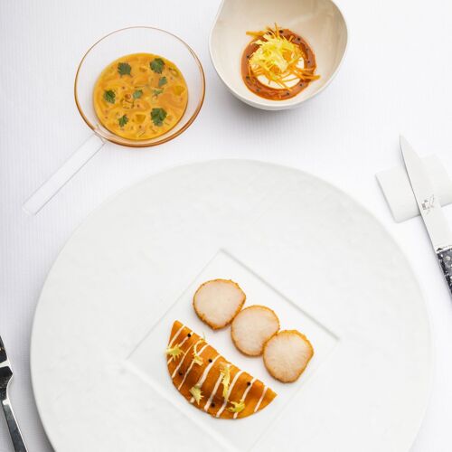 Set among flower gardens and century-old trees, this fully restored 16C Breton estate has been enhanced by an elegant contemporary extension. In this refined setting, chef Olivier Samson (formerly of La Gourmandière - La Table d'Olivier) showcases his talent. His refined contemporary cuisine is deeply rooted in the local terroir and presented in the form of tasting menus. Celtic produce is handled with precision: Breton abalone with spinach and a pork jus; sole from small-boat fishing with asparagus and kumquat; roast pigeon with cocoa and pigeon leg bonbon. In dish after dish, buckwheat, sea fennel and buttermilk underscore the Breton identity of this gourmet experience.