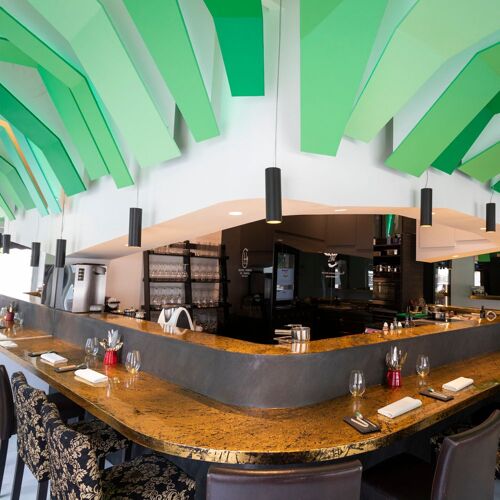 This restaurant brings a breath of fresh air to Toledo’s dining scene! Following a trip to Japan, the chef returned home with the idea of setting up a restaurant in which the bar counter would take centre stage, and where he would cook, prepare and present dishes in front of guests as in a typical sushi bar. This extremely comfortable restaurant, designed to seat 16 guests, boasts a surprising design, with a decor of golden tones and a ceiling covered with striking geometric shapes. The single, particularly interesting tasting menu features contemporary, market-inspired dishes such as tuna with white garlic, creamy rice with wild boar, and a “coolant” of marzipan with cheese and passion fruit.