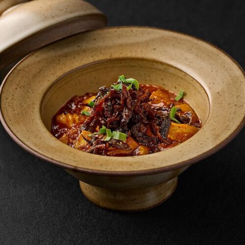 Nestled in a quiet hotel next to Daci Temple, this restaurant is an oasis of calm. The courtyard house exudes historical charm, with the open kitchen lending an airy feel. Hand-picked local produce is used to create light, refined and inspired vegetarian dishes, such as vegan mapo tofu with chanterelles. There is also a set menu that supports small local farms near panda habitats, featuring ingredients like Mianyang porcini and Ya'an radish.