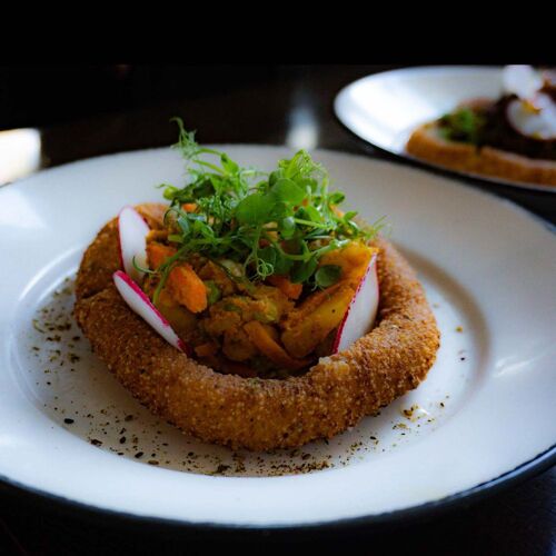 Inside, at the bar-counter set abuzz with vibrant tunes, the kitchen team takes classic Indian cuisine in a novel direction. Is that blue cheese on your tandoor-grilled chicken kebabs? Yes, indeed. Matched with sour cherry reduction and cashews, it's as enticing a preparation as the boldly spiced minced bison momos. Nariyal lamb shank is rich and robust with saffron, chili and coconut. Sop up the heady sauce with light basmati rice and call it a night.