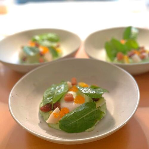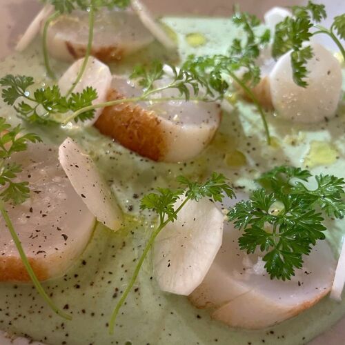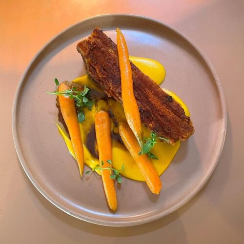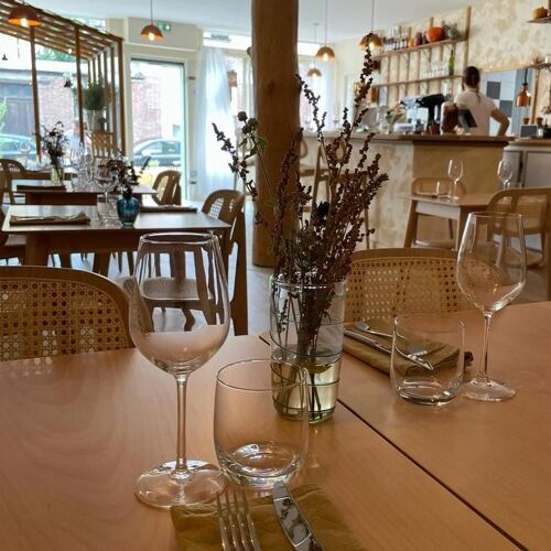 Chef Yann Caputo is a big fan of vegetables, which he grows in his own vegetable garden and sources from small local producers. Here in his "garden bistro", he also likes cooking fish, mainly from Brittany, in homage to his native region. The reasonably priced lunch menu is a steal. The evening menu features more high-end ingredients, which are always accompanied by vegetables from the chef's garden: seared langoustines with peanut and satay, green apple tartare with mint and tarragon; turbot and garden vegetables, hazelnut sabayon, trout roe and lemon caviar. The charming decor with a natural vibe (strings of garlic, wheat and dried flowers on the walls etc) and wooden furnishings foster an inviting atmosphere.