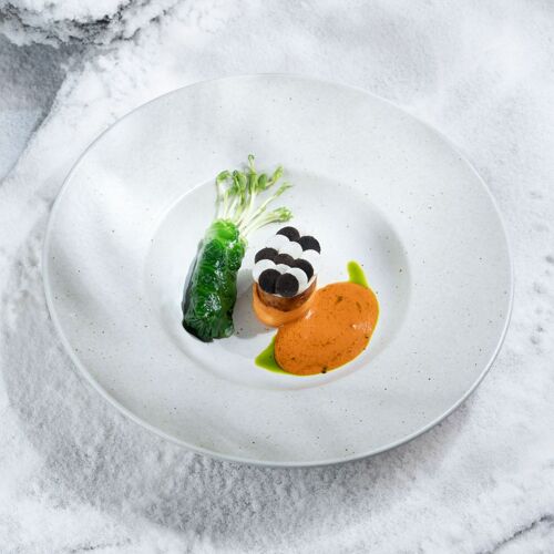 Slat wood panels, exquisite bonsai, a soundtrack of a flowing river – it all imparts a Zen-like ambiance. The young chef has extensive experience in plant-based cooking and the single tasting menu features the season's best produce. The course water bamboo three ways, in particular, showcases the chef's vision and meticulous skills. The plant is grilled, basted in sauce, oven baked and made into a roll, for varied textures and flavours.