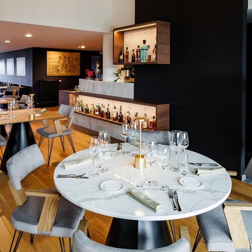 From the outside it is a small brick farmstead nestling in the green countryside, inside, however, diners are greeted by a surprisingly airy and contemporary décor. A family - run establishment that specialises in generous dishes with a dash of originality prepared on the spot. Fantastic wine list.