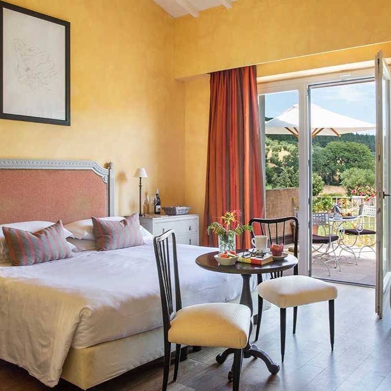 As for the atmosphere, it’s a disarming blend of professional hospitality and guest-house intimacy, with breakfast ordered in the kitchen, right over the cook’s shoulder; the and served in the drawing rooms or out on the patio. The relatively casual Restaurant La Villa serves classic Tuscan fare in the house’s dining room; the main culinary event is La Trattoria Enrico Bartolini, set in the estate’s old granary.