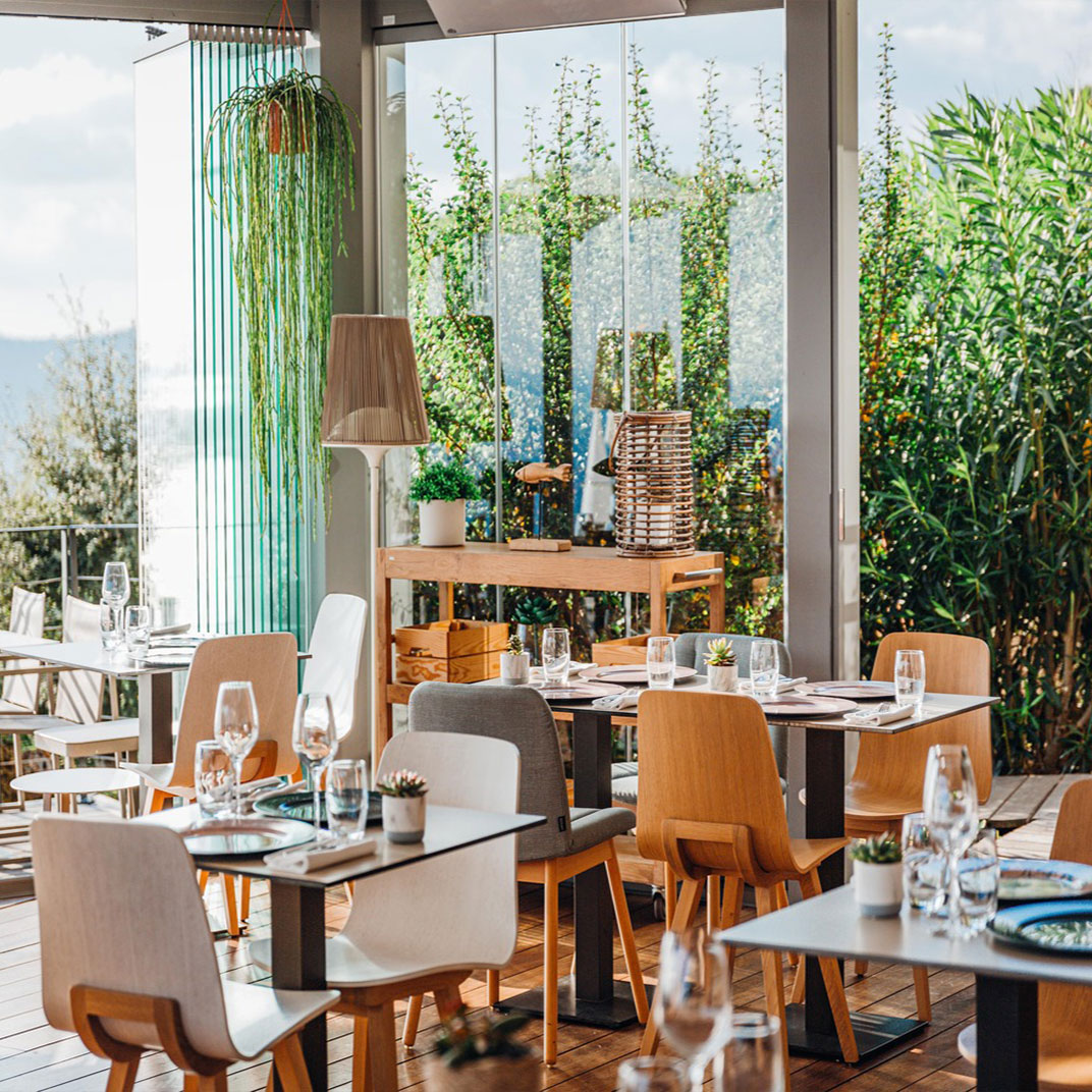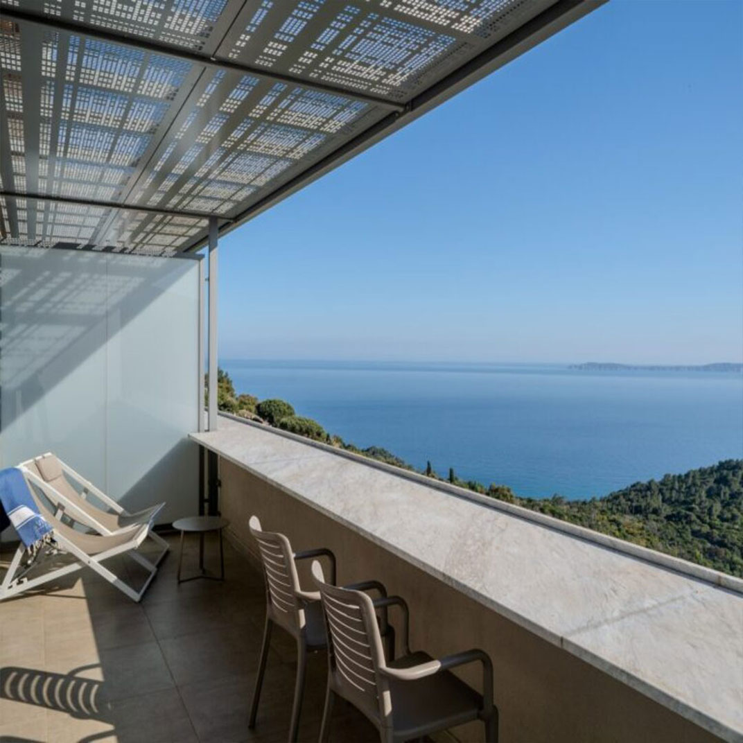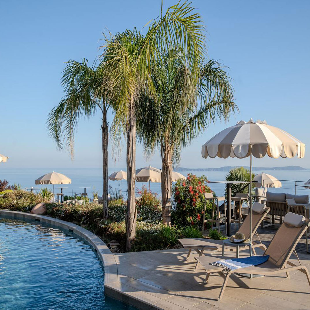 Its rooms and suites offer views out to sea, either from balconies or terraces or through panoramic windows; their contemporary interiors are softened by artworks and textiles depicting butterflies, dragonflies, and various plant life. The standard rooms are cozy but comfortable, with Italian-style showers, while the suites expand to generous dimensions, and the two-bedroom family-style “Flat Suite” adds a bathtub.