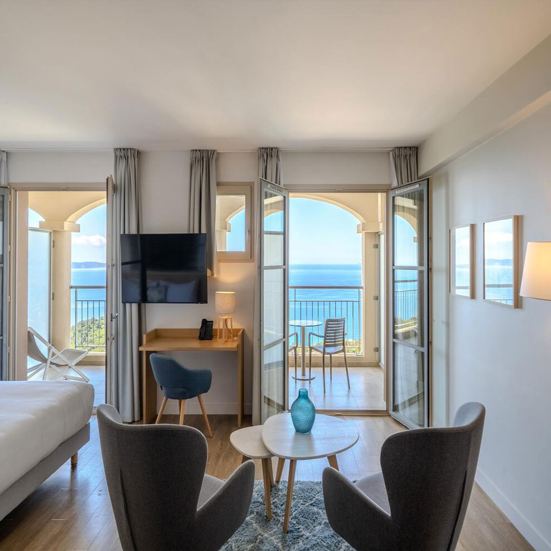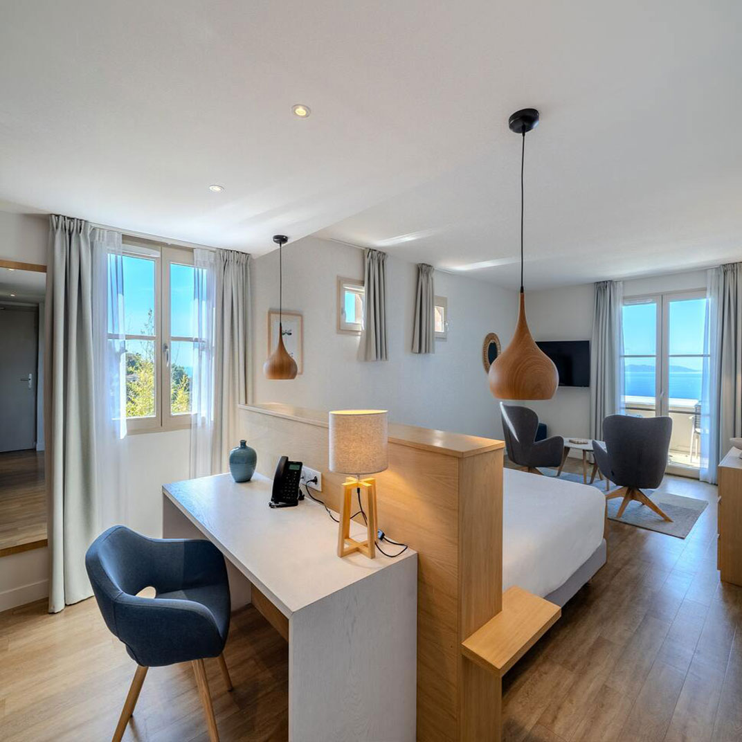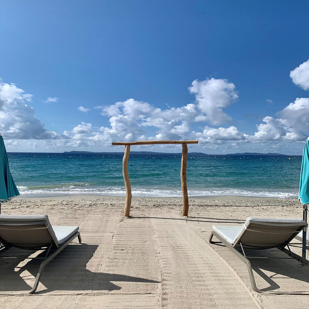 There’s a pool, a solarium, and a treatment room for spa services, while a shuttle connects the hotel with Rayol Beach. Le Club Papillon serves breakfast on the terrace facing the sea, and becomes a cocktail bar in time for an apéritif; Restaurant L’Envol is open to the public for lunch and dinner on its own terrace, and features a seasonal, organic menu with vegan options courtesy of chef Clement Torrente.