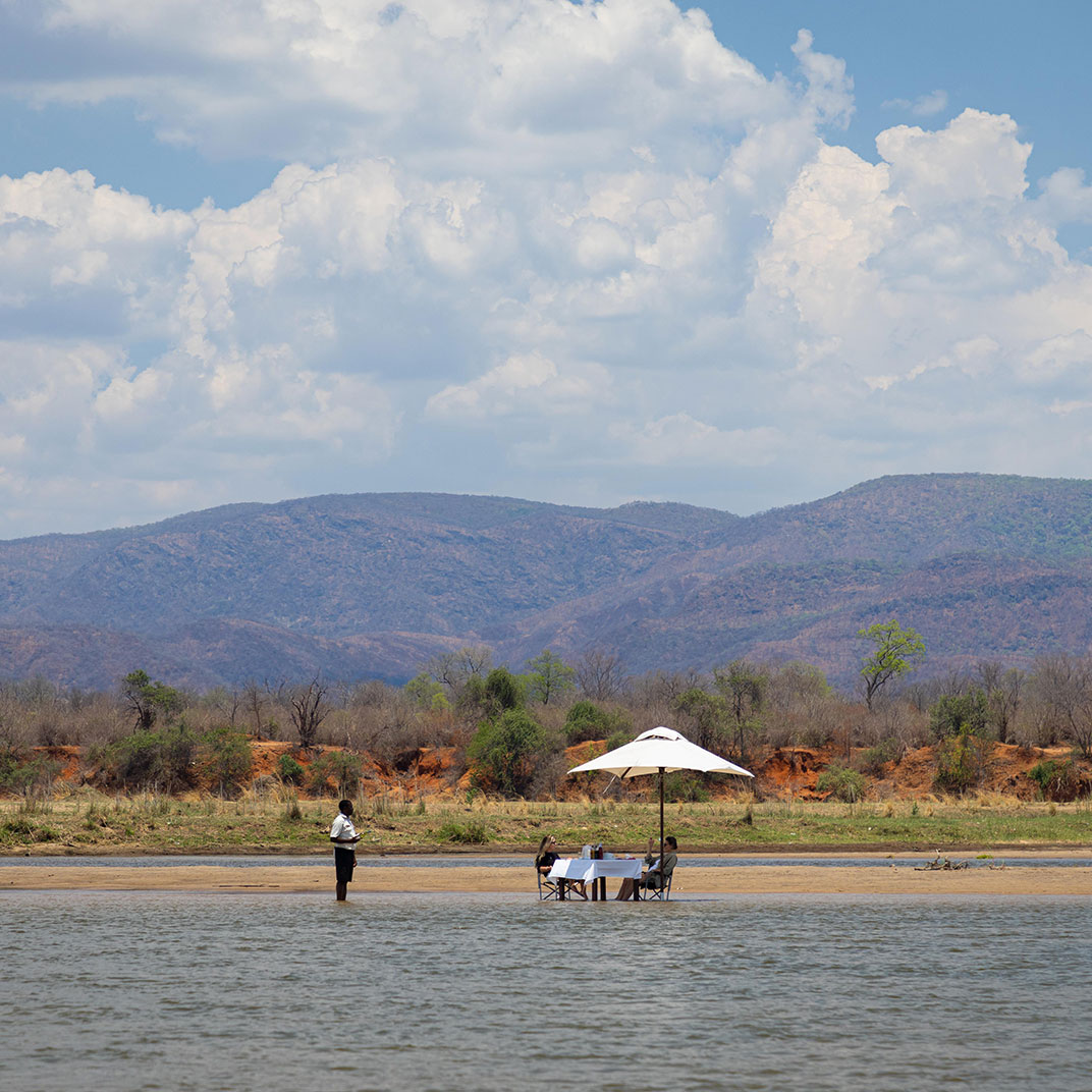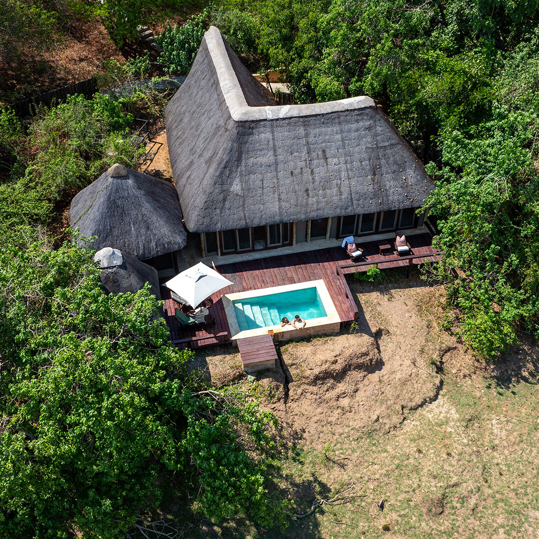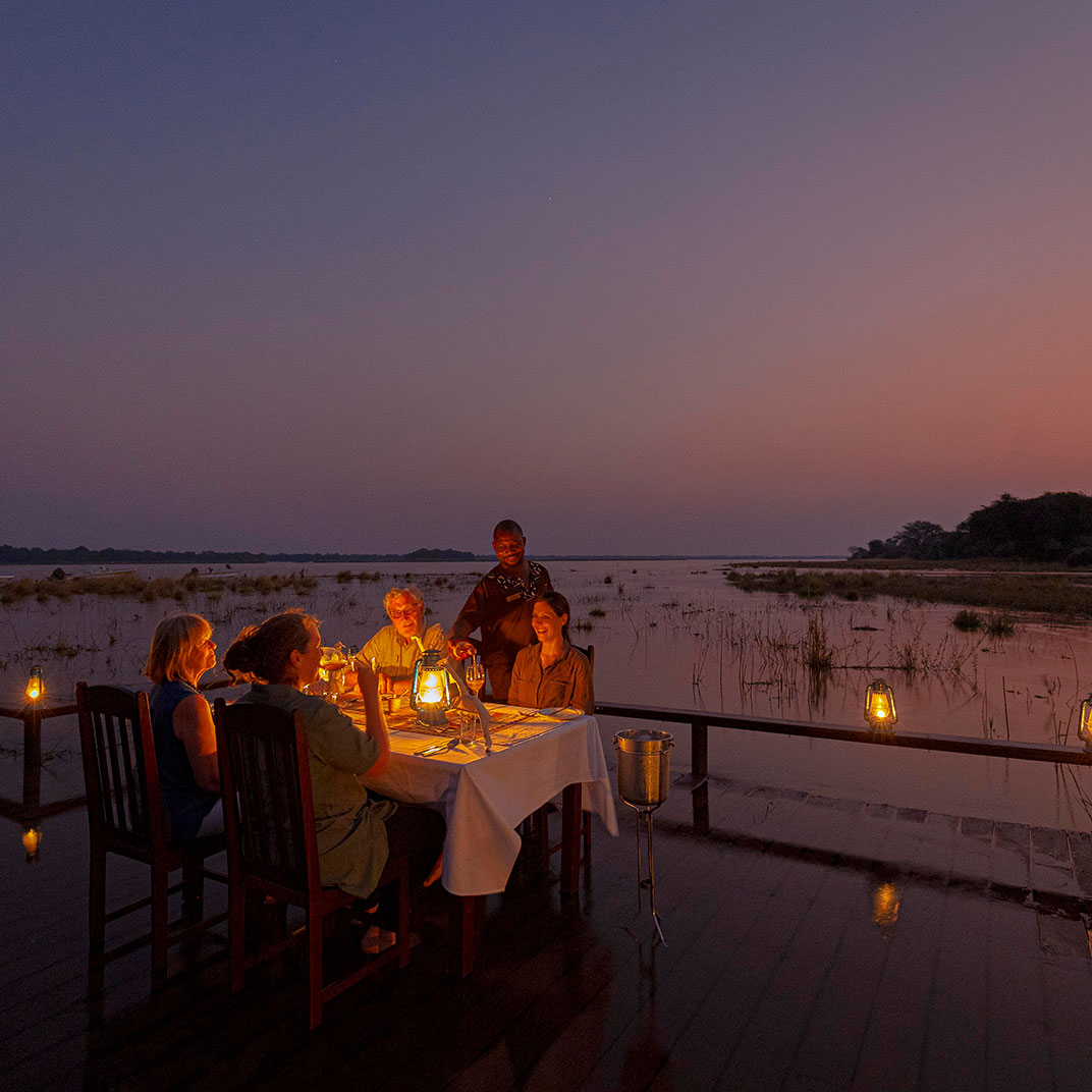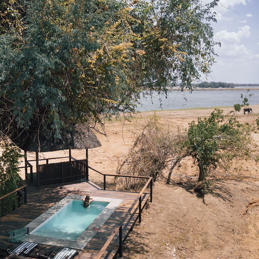 Royal Zambezi Lodge is situated on nearly 500 acres in the pristine Chiawa Game Management Area, directly across the river from Mana Pools National Park, a UNESCO World Heritage Site, and just minutes from the Lower Zambezi National Park. Its fifteen airy suites take full advantage of its unforgettable location, with views from every angle along with expansive decks and patios; plunge pools and secluded spaces in each suite offer private spaces for relaxation. The Royal Bush Spa offers views of the Zambezi River and a wide variety of massages and skincare treatments using locally sourced ingredients. The restaurant serves three meals a day plus afternoon tea; lunch can be packed up for the road, as you’ll likely spend your days on safari in the park.