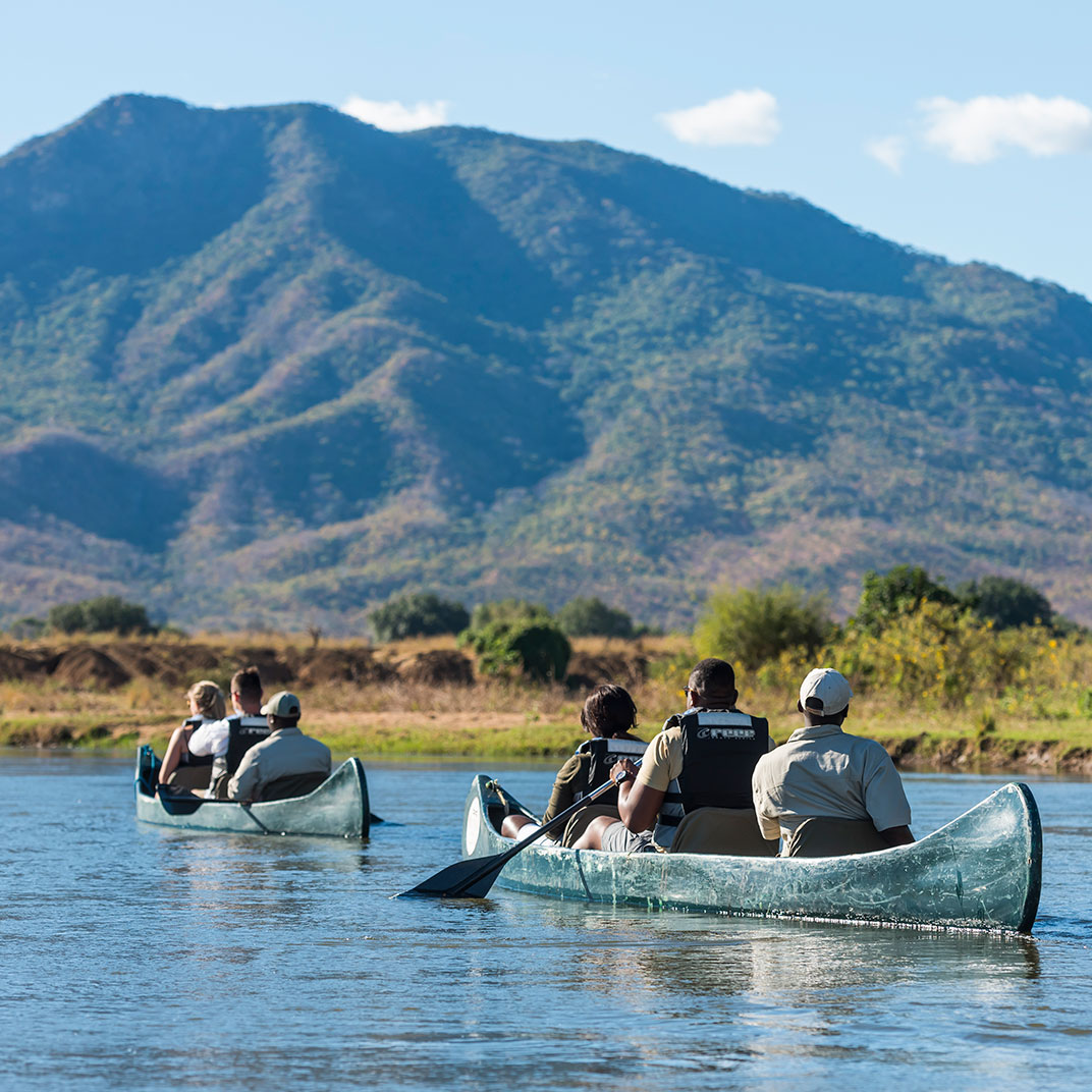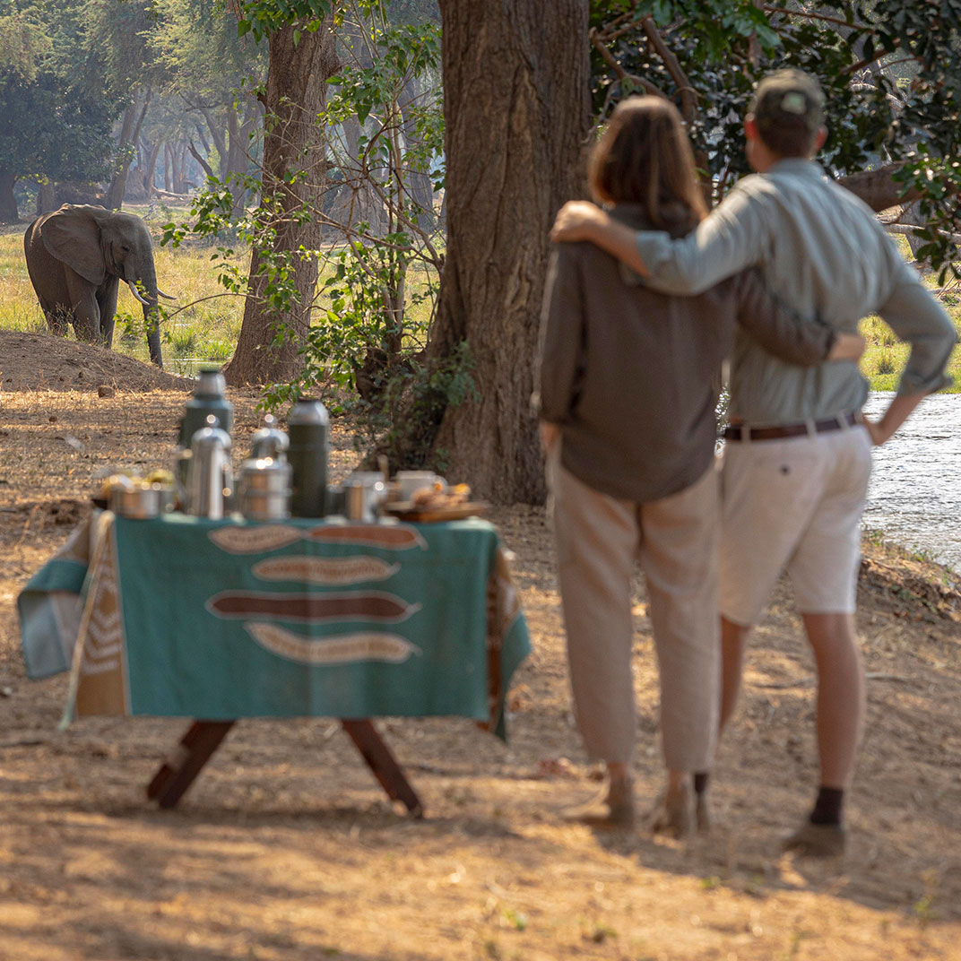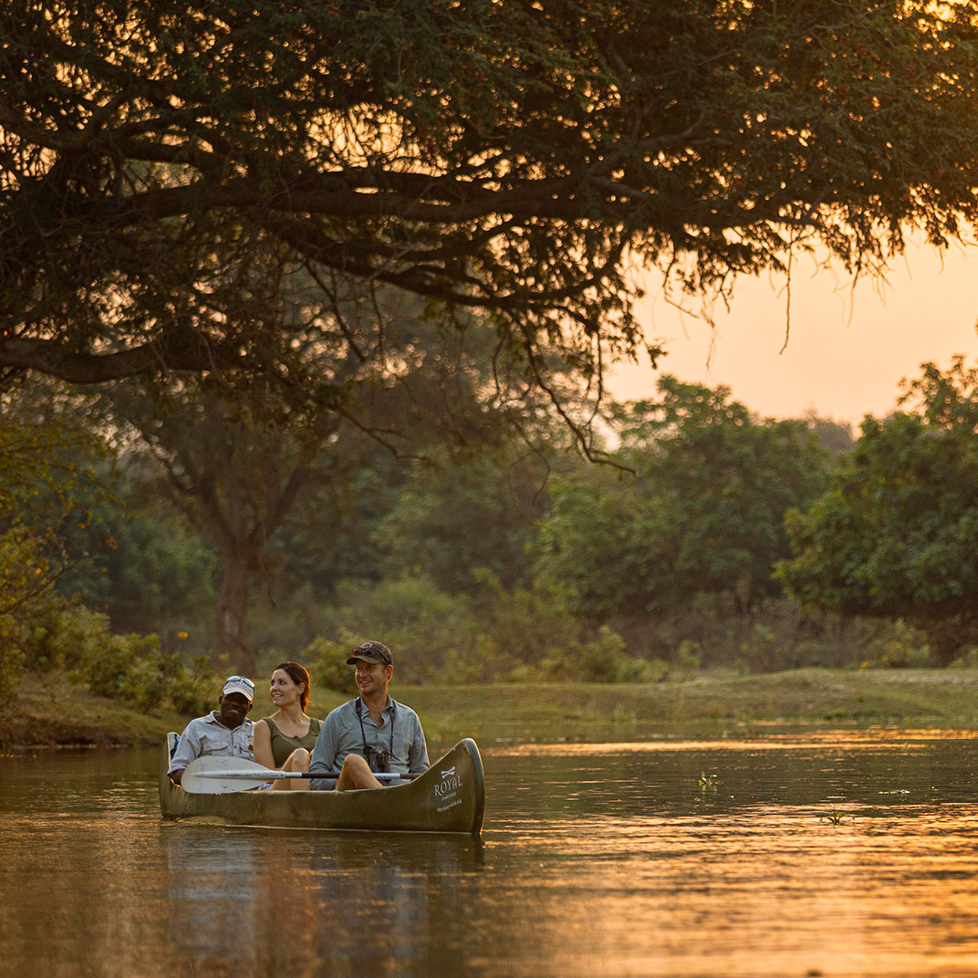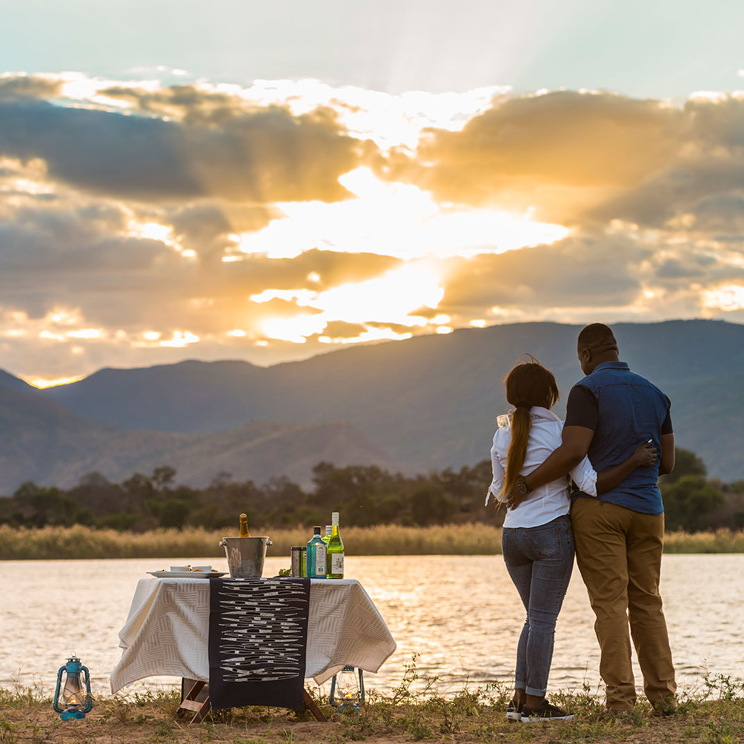 Royal Zambezi Lodge is situated on nearly 500 acres in the pristine Chiawa Game Management Area, directly across the river from Mana Pools National Park, a UNESCO World Heritage Site, and just minutes from the Lower Zambezi National Park. Its fifteen airy suites take full advantage of its unforgettable location, with views from every angle along with expansive decks and patios; plunge pools and secluded spaces in each suite offer private spaces for relaxation. The Royal Bush Spa offers views of the Zambezi River and a wide variety of massages and skincare treatments using locally sourced ingredients. The restaurant serves three meals a day plus afternoon tea; lunch can be packed up for the road, as you’ll likely spend your days on safari in the park.