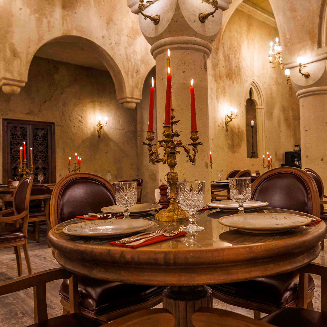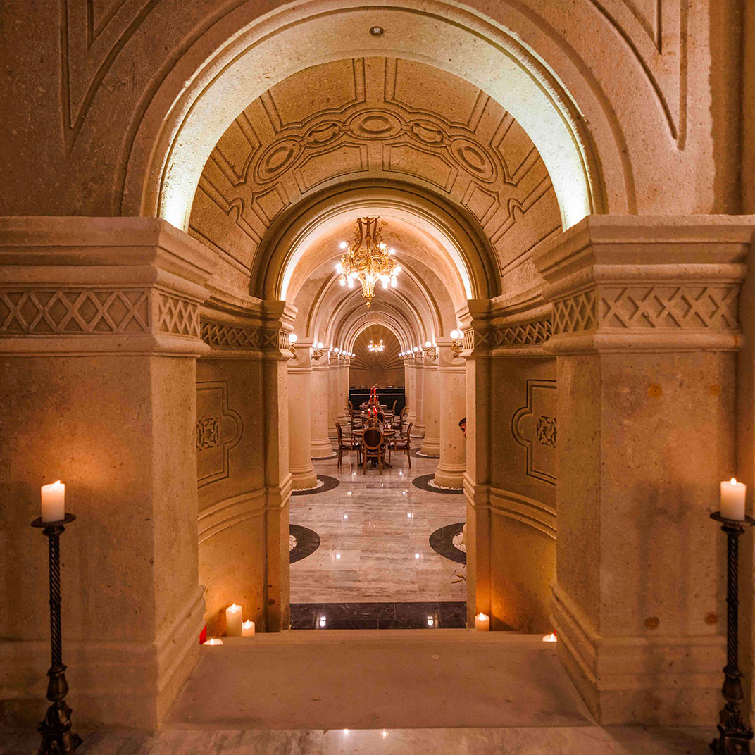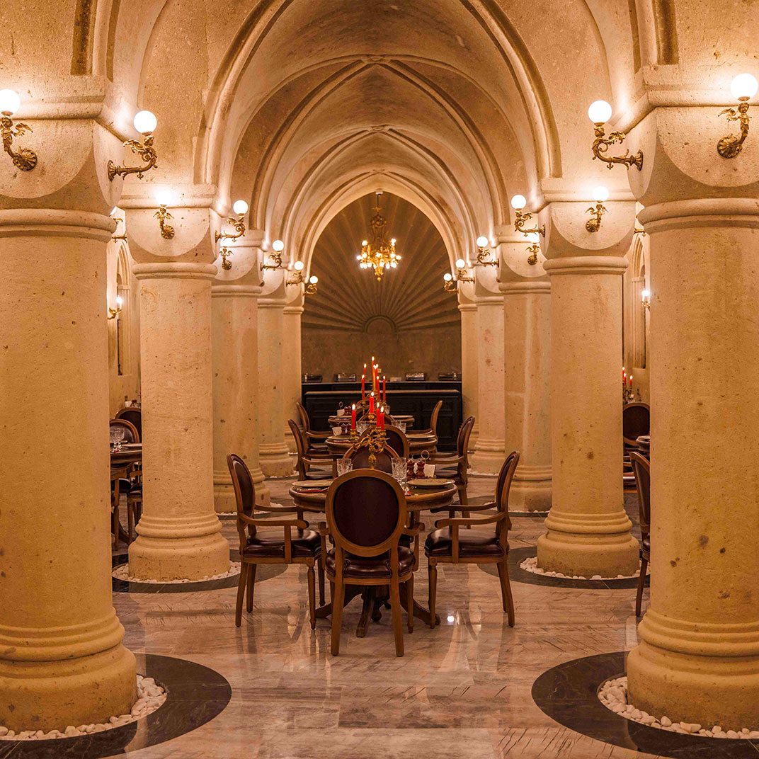 It’s an all-suite property, and many of the units come with luxe extras like fireplaces, jetted tubs, Turkish baths, or hammams. The restaurant, too, occupies a substantial underground space, possibly the hotel’s most refined environment, thanks to its columns, arches, and polished stone floors. There’s outdoor lounge space as well, for catching a glimpse of the sky, and tours of the region are available via horseback and hot air balloon.