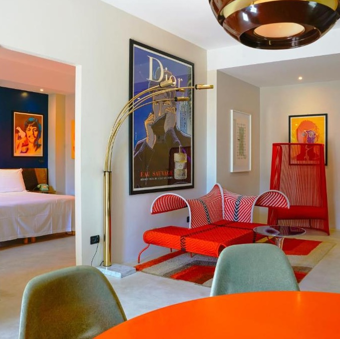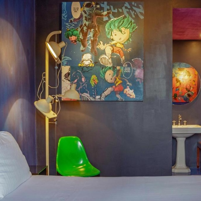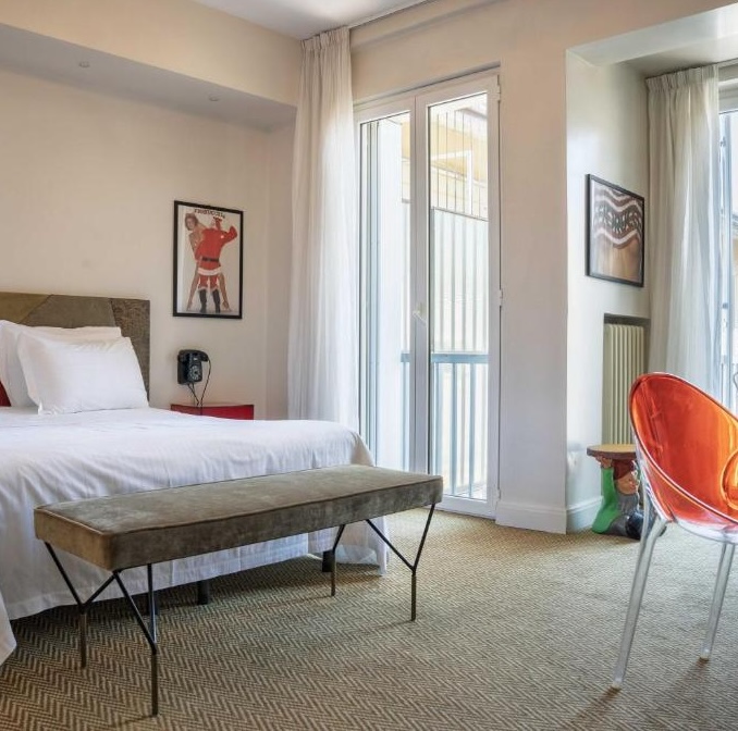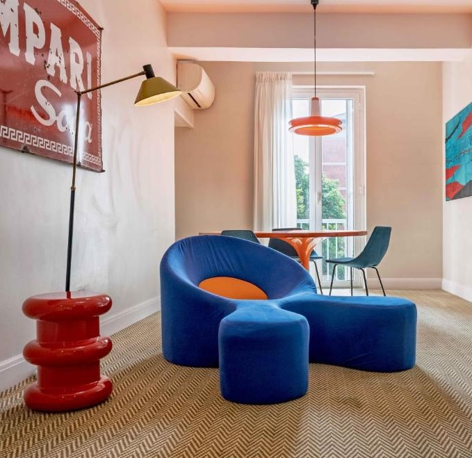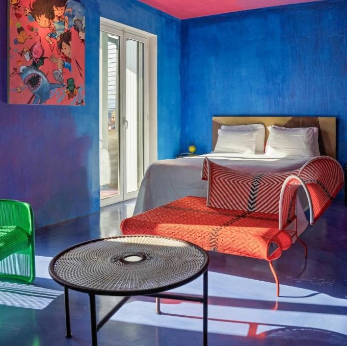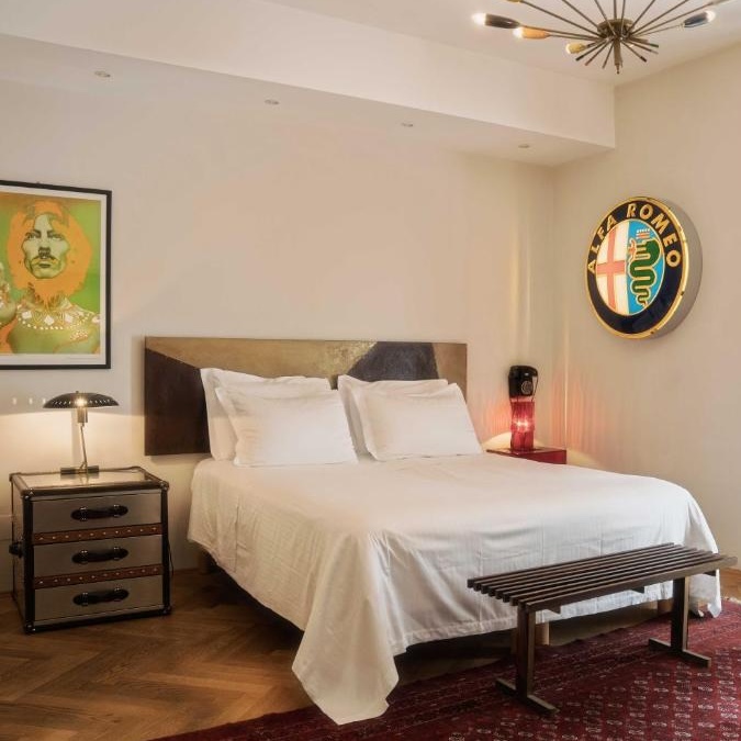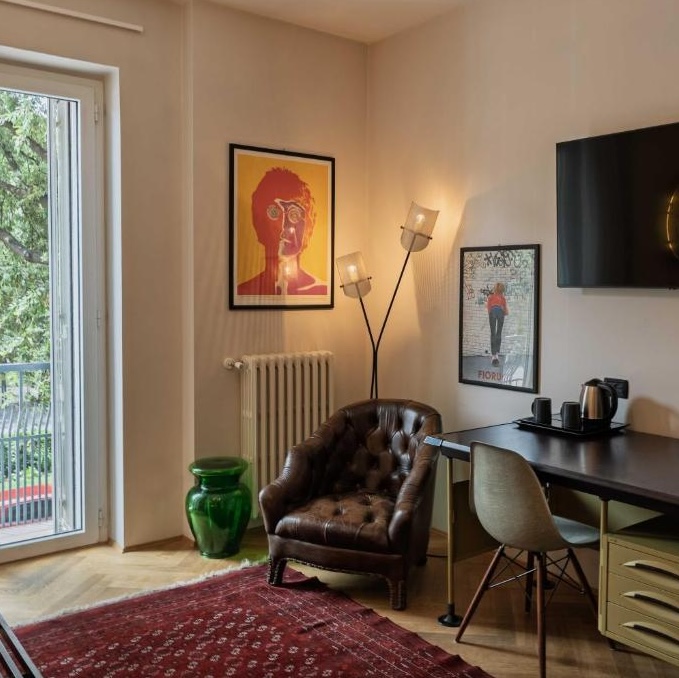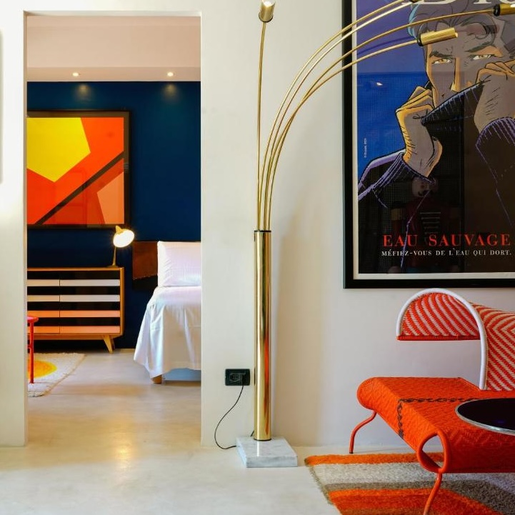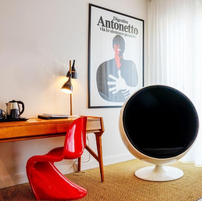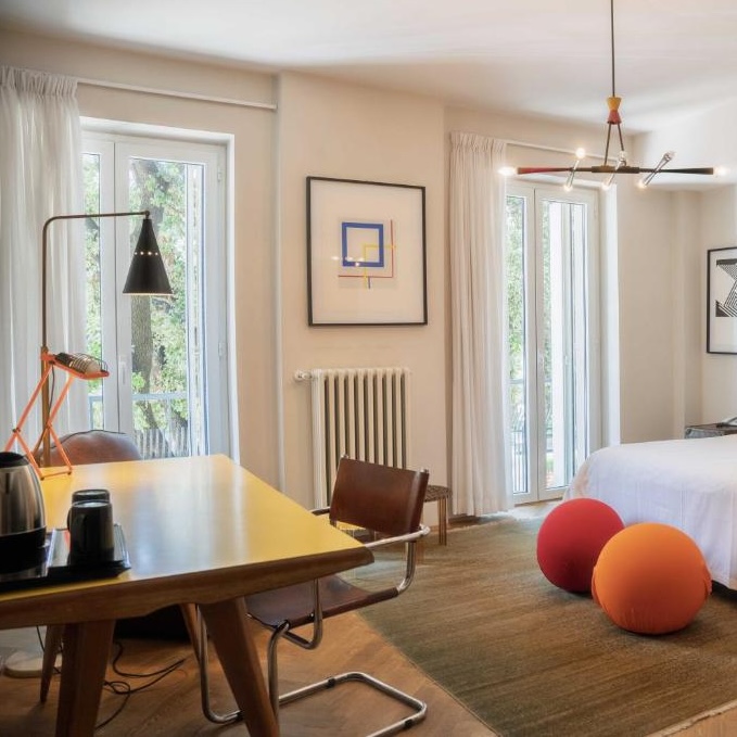 Verona might bring to mind Shakespeare’s star-crossed lovers Romeo and Juliet, but it’s art and design rather than literature and theatre which has inspired Boutique Hotel Trieste. The intimate hotel sits on a street that leads directly to the Arena, Verona’s famous Roman amphitheater, and makes a strong first impression with its boldly colorful lobby and bar, decorated with a mish-mash of electric blue and leopard print, sculptural gilded light fittings and large-scale contemporary artworks. The 16 individually decorated rooms and suites are equally bright and eclectic with a mix of retro designer furnishings, vintage finds, and blown-up posters of cultural icons and brands.