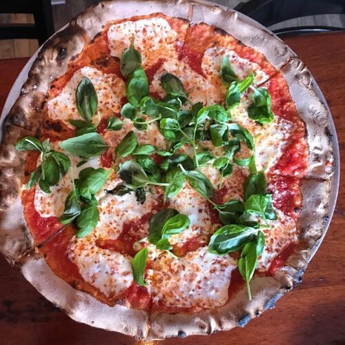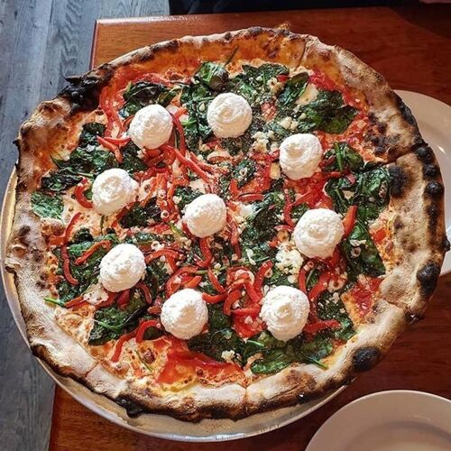 Sure, you could come for a salad, but the focus here is on pizza—and yours should be, too. The dining room is cozy, showcasing an open kitchen where pie production is on full display for all to see. And in a playful bit of recycling, empty tomato sauce cans placed on each table become stands for sizzling pizzas churned straight from the 800-degree coal-fired oven.