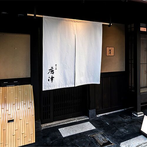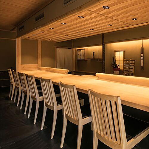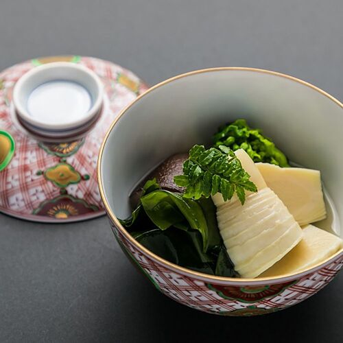 An amiable couple from Nagasaki run this restaurant. The husband, an admirer of Kyoto cuisine, left his family’s kappo restaurant to gain experience in Kyoto. As he studied ways to present food, he fell in love with the bounty of ingredients available and decided to go independent. His habit is to visit producing regions, securing fresh ingredients in season, such as picking wild edible plants and mushrooms in Miyama and angling for sweetfish in Shiga. Under the tutelage of a potter, he makes his own ceramics, on which the couple serve their culinary creations.