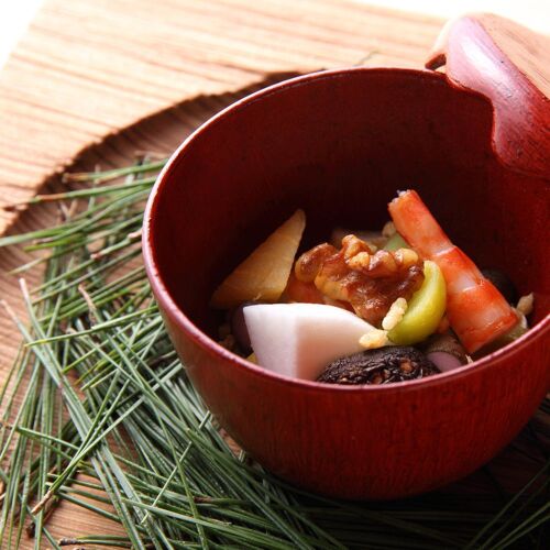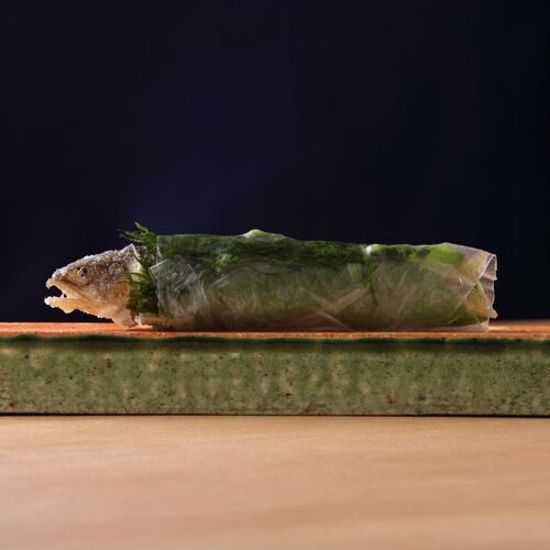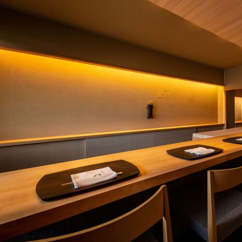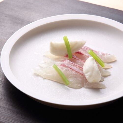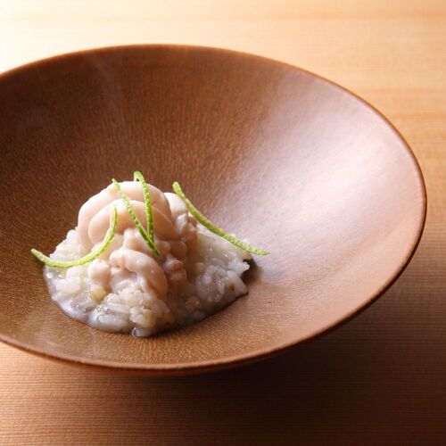 Tsukasa Miyashita’s menu is the product of guidance from two mentors. At a ryotei, he learned that cuisine lives and breathes by its ingredients; at a kappo, that nothing is more important than pleasing the customer. Inspired by these two lessons, Miyashita puts his own unique stamp on Japanese cuisine. Amuse-bouche between meals is a new endeavour, a gruel of vinegared rice. Fresh spring rolls of Japanese ingredients are wrapped in rice paper, adding an extra touch of Japanese sensibility. A dialogue between tradition and avant-garde.
