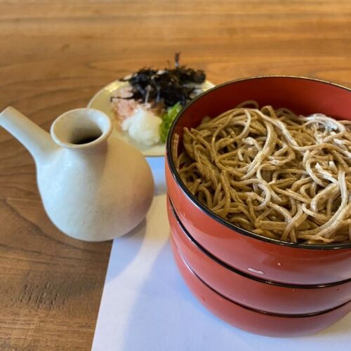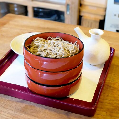Izumo soba is a local cuisine of Shimane. The family moved to this location from Shimane and opened this restaurant to introduce the taste of their hometown. Nana Nitta, who took over the restaurant from the father, mills the unpolished buckwheat. This is what gives Izumo soba its blackish colour. The thin juwari soba is served with broth poured over it. Another cultural tradition of Izumo is the three-tiered vermilion-lacquered serving dish called a ‘warigo’.