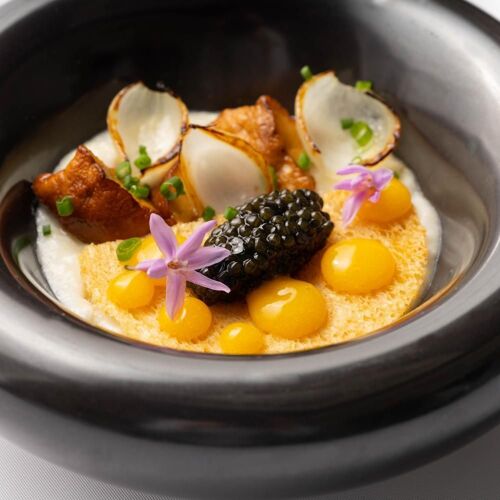 With a name like Cavar Russe, there’s no ambiguity about what sort of experience is on offer: a parade of luxury ingredients with eye-watering prices to match. Diners are led up a marble staircase at this posh jewel box, where views looking out over Madison Avenue below feel classically New York Offerings of the namesake range from a relatively attainable dollop of Pacific Sturgeon to 500-gram tins of Osetra that cost more than first-class tickets to the Caspian Sea. The French-inflected menu, available as either a prix fixe or à la carte, straddles classic and contemporary, as in fresh pasta agnolotti stuffed with chestnuts, dressed with black trumpet mushrooms and gilded by Périgord black truffle and foam. Dover sole is elegantly plated, stuffed with fish mousse, and draped with a refined curry cream sauce.