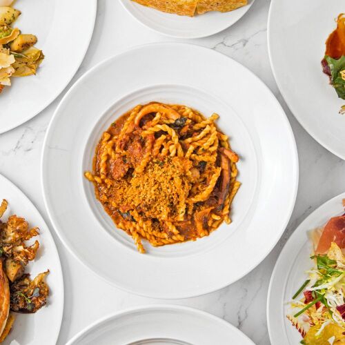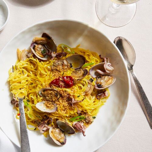 Finely made pastas include casarecce with pieces of lump crab, uni puree, and tomato. Finish with a beautifully made dessert like the blueberry filled meringa with whipped white chocolate