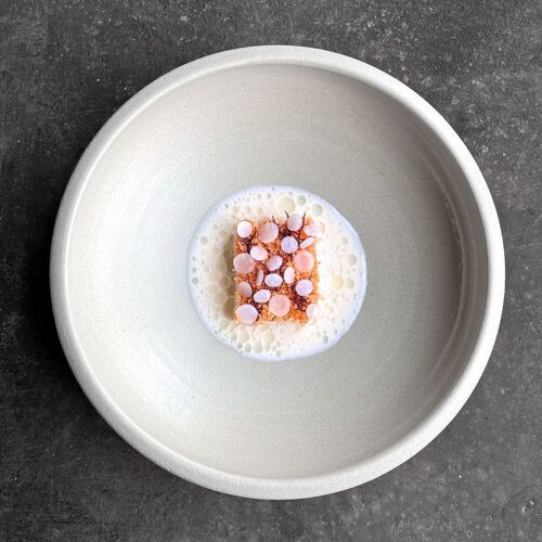 A grilled green asparagus cream, for example, is topped with pieces of asparagus poached in lapsang souchong tea, a fine julienne of raw white asparagus, a subtly spicy almond and horseradish ice cream, fresh green strawberries and, to finish, a vinaigrette of filtered gazpacho enriched with elderflower. This is what they call "spring on a plate"! This is cuisine with a clear identity: profound, vibrant and singular.