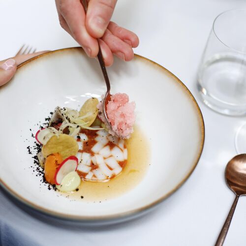 ML is a firm favourite for many a foodie. Mark and Liane Gratama's restaurant is housed in an imposing listed building in the heart of Haarlem. The modern decor blends vintage elements with chic design. The Chef’s Bar, next to the open kitchen, is the place to be if you want to watch the enthusiastic Mark Gratama at work. Each dish is a creative masterpiece, playfully combining a delightful variety of textures. His unique ingredient combinations demonstrate his willingness to experiment and push culinary boundaries. For example, he incorporates a hint of seaweed into a blueberry-based dessert and a zesty verjus sorbet. With meticulous precision, he unites the disparate flavours of seared langoustine and hearty beef sausage into a perfectly balanced dish. The finishing touch of an exquisite sauce or broth, frequently drawing on Asian influences, provides extra punch. It is inspiring to watch this consummate professional constantly evolve his craft.
