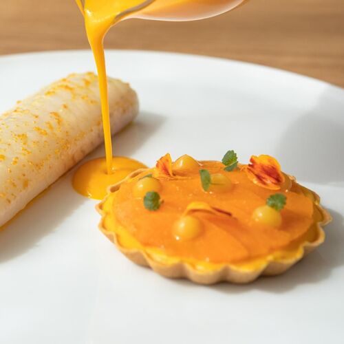 In a pared-back interior dominated by wood and white features, Marc-Antoine Lepage (previously of Les Foudres, but also a former sous-chef at Le Mirazur) and Adeline Lesage (who also worked at Les Foudres) combine their talents to serve up modern cuisine that is full of lightness and interplays of textures. The artichoke cream, basil berlingot, purple artichoke barigoule is a festival of nuances and subtle contrasts; the lobster cooked in shellfish oil, chanterelles, honey and tarragon also delights the taste buds. Meat is the star of the show, alongside fish and seafood. A single surprise set menu comprising several courses.