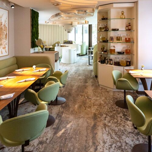 This 1920s Art deco building has a modern extension replete with curving floral scrolls and a rotunda dining space decked in soft, natural materials echoing organic shapes. The couple at the helm, Stéphan Paroche and Justine Viano (formerly La Table de Castigno), crafts a modern programme in the form of several surprise menus, including vegetarian options. Indeed, it is their veggie-centric compositions – such as the appetisers or the seafood starter – that best exemplify the couple’s high-flying talent. The excellent wine list, featuring wines from Languedoc and Roussillon as well as the Rhône, is well worth a gander.