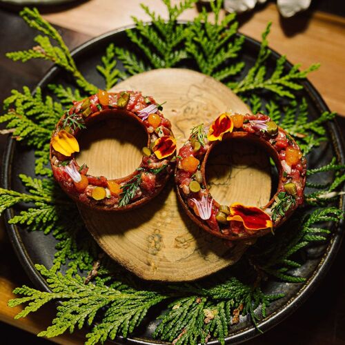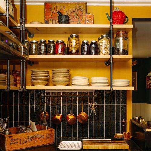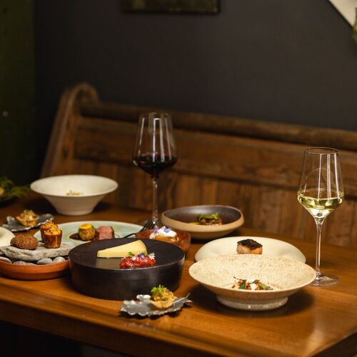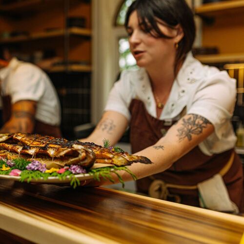 Known for their time at Sumac & Salt, Chef Joel Gray and Hannah Harradine apply a heartfelt approach by welcoming diners into their own home in Grey County for a charming, intimate experience. Here, an interior kitchen and a barbecue are used to create a meal that spotlights excellent local products. Everything is lovingly presented by the team, with the chef offering explanations of many of the courses. Standouts include pieces of coal-roasted beets arranged with pickled pumpkin and dabs of creamy pumpkin seed purée. Trout brined with spruce tips is slow-smoked then quick-seared and presented with Ontario potatoes, fiddlehead ferns, and trout roe. Braised lamb neck stuffs a wild leek raviolo dressed with a preserved green tomato jus, giving a subtle hint of spice.