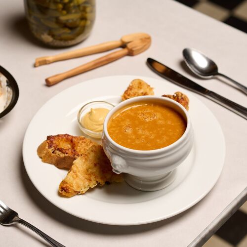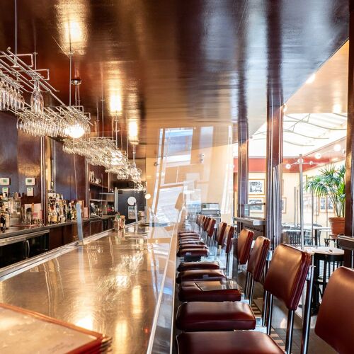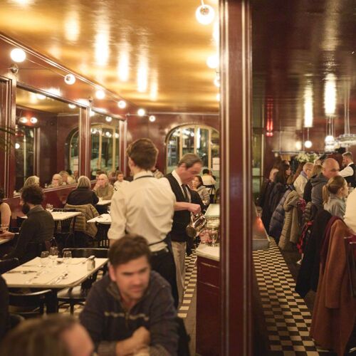 Here in the Plateau Mont-Royal, this historical bistro has been serving happy diners for several decades. Founded by theater enthusiasts, it has become a must for night owls (last orders at 12:30am). A large Parisian-style counter lit by Art Deco lamps, burgundy walls, mirrors, and black-and-white tiles make for an inviting decor. The handwritten menu promises culinary authenticity. Chef masters the French classics: celery remoulade, chicken liver pâté, smoked herring, beef tartare, veal kidney in mustard sauce, and grilled salmon with lentils and spinach. For dessert, don't miss the maple profiteroles and the île flottante with caramel. Smiling and efficient service along with carefully selected Burgundy wines and Québec vintages complete the experience.