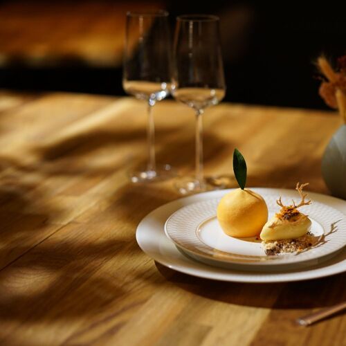 Having worked at Lilly in Neupotz, Stefan Echle (service) and Matthis Nowak (kitchen) have found their new vocation – in the vaulted cellar of the separately run Villa Königsgarten hotel (formerly Diehl winery). A few steps lead down from the courtyard to the restaurant. As you make your way to the dining area, you can take a peek into the glass-fronted kitchen to see the chefs creating their modern seasonal set menu, which offers a choice of options for each course. Named after a fairy tale by the Brothers Grimm (The Lying Goat), the restaurant has a modern, elegant interior with a historical touch. Great service comes courtesy of a friendly and well-trained front-of-house team. The idyllic location in a village surrounded by vineyards, at the foothills of the Palatinate Forest, offers endless possibilities for excursions.
