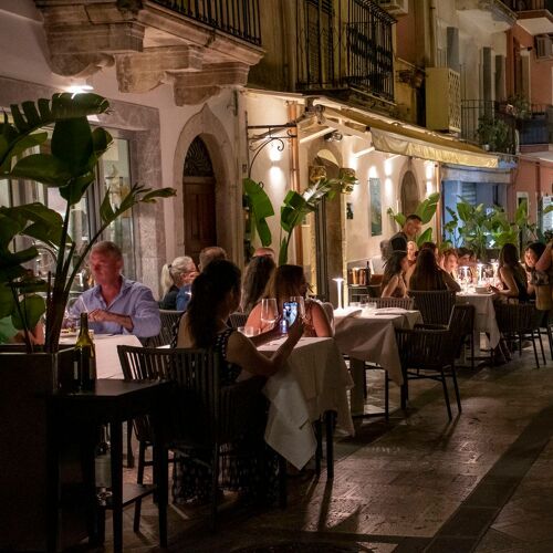 Situated in the historic centre of Taormina, just a stone’s throw from Corso dello Struscio and the many brand-name boutiques that have sprung up here in recent years, this restaurant started out as a wine-bar. The passion for wine remains and is evident not only in the extensive, carefully selected wine list, but also in the enthusiasm of its staff. Nowadays, the wine accompanies fine cuisine prepared by the skilful Dalila Grillo, whose brother Ettore oversees the front of house. Guests have the option of two tasting menus or an à la carte (from which a minimum of three courses must be ordered) featuring creative and elaborate dishes with a Sicilian flavour (as well as influences from elsewhere), all served in an elegant dining room. In summer, the outdoor tables overlooking a pedestrianised street are particularly attractive.