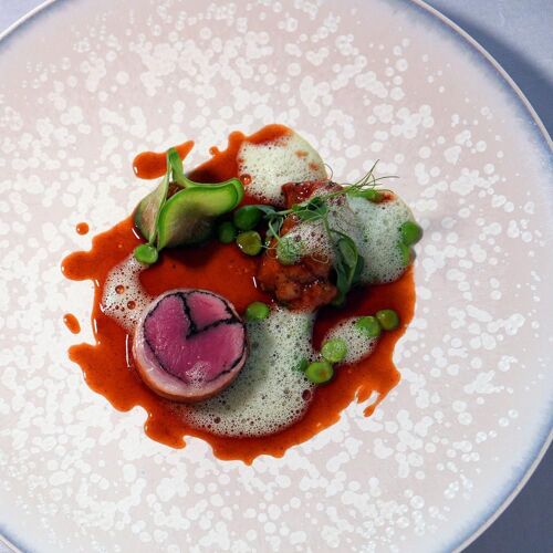 Satoru Asahina pursues a gastronomy of ‘traditional heritage with modern innovation’. He delves into the history of French cuisine to reconstruct ancient recipes with his own interpretations. The prix fixe meal begins with a colourful amuse-bouche and proceeds to plates adorned with multi-layered culinary creations. Consommé pressed through a siphon with a flourish and desserts paraded on trolleys catch the eye. Classic cuisine tuned up to point to the future.