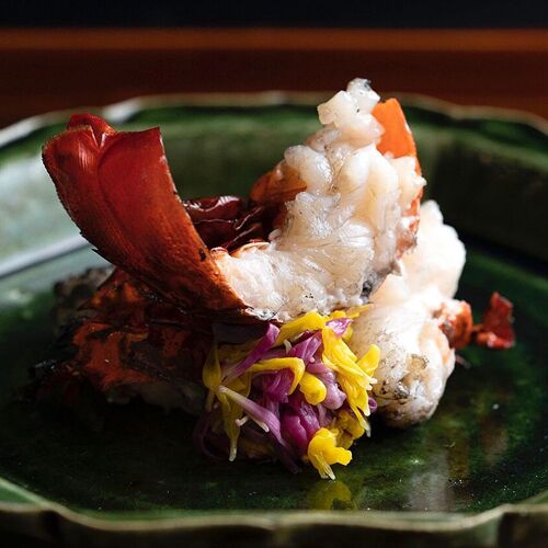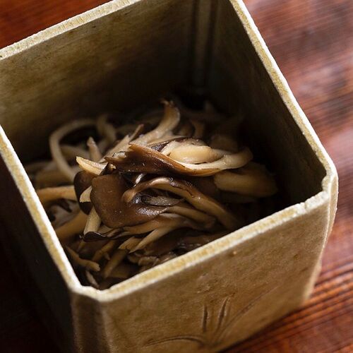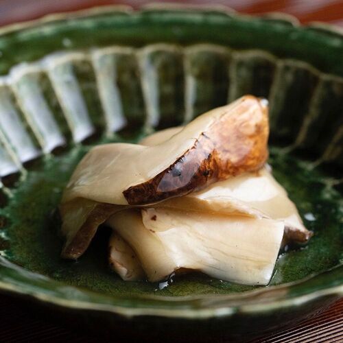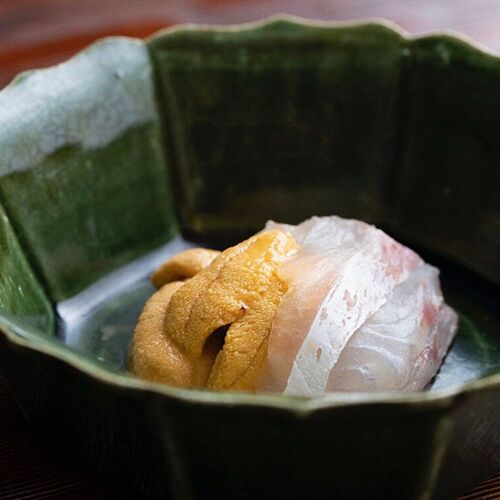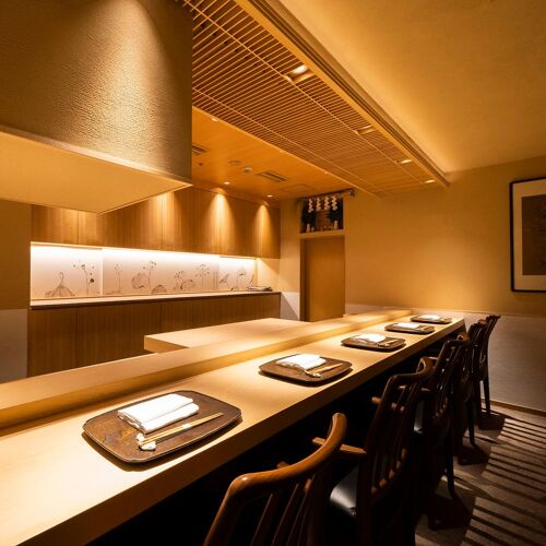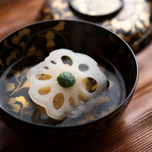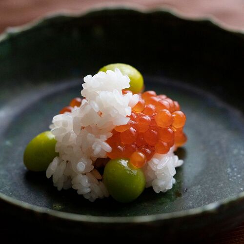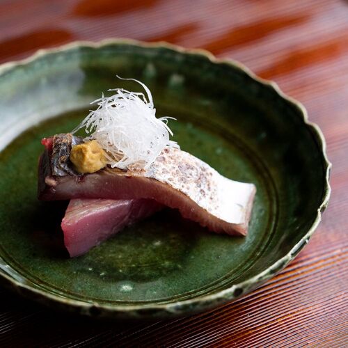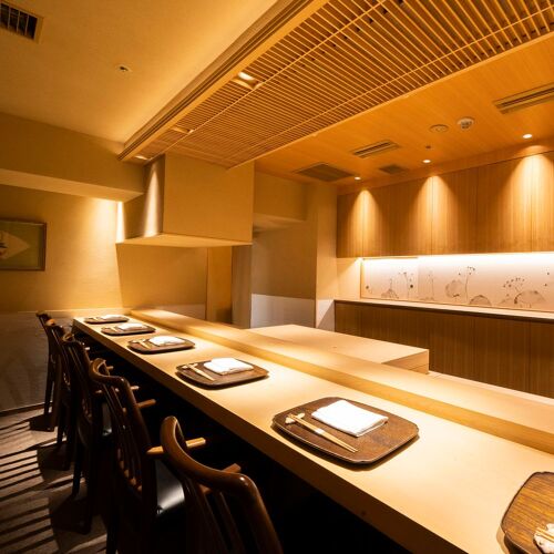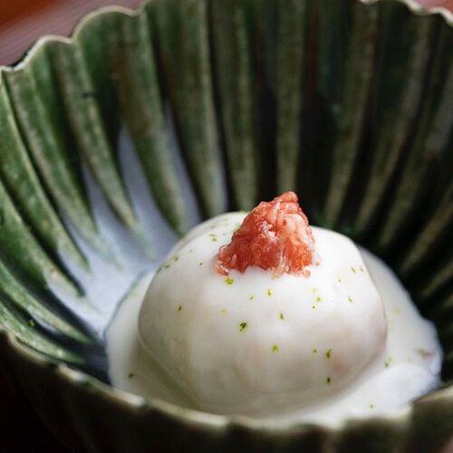 True to his creed, ‘Life resides in cooking that is free of affectation’, the chef strives to serve food that is honest and down-to-earth. Paying close attention to the strength of his cooking flame, he sources the flavours of each season—bamboo shoots, pike conger, matsutake mushrooms, and puffer fish—and slow-cooks them over charcoal. Indian-ink paintings behind the counter depict lotuses in each season. In the language of flowers, the lotus represents a pure and chaste spirit. The chef’s honesty and respect for foodstuffs are reflected in his carefully pared-down creations.