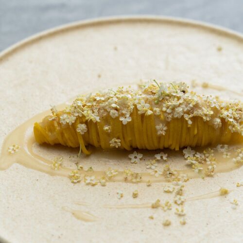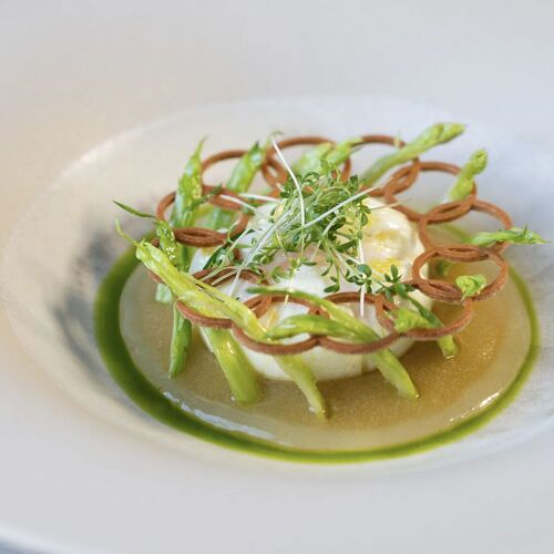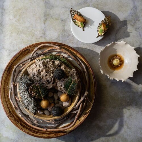 "My menu revolves around the Borgo Santo Pietro farm in Chiusdino: 120 organic hectares with vegetable gardens, vineyards, orchards, and a farm that houses chickens, sheep, pigs, turkeys, and rabbits, enriched with fermented products from our in-house laboratory."