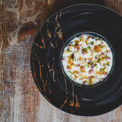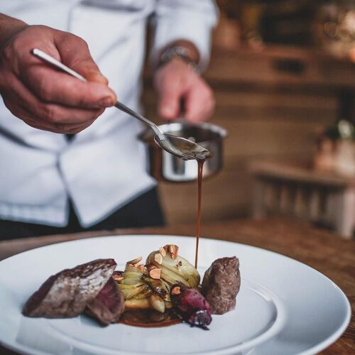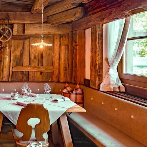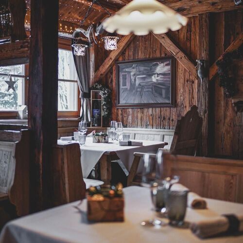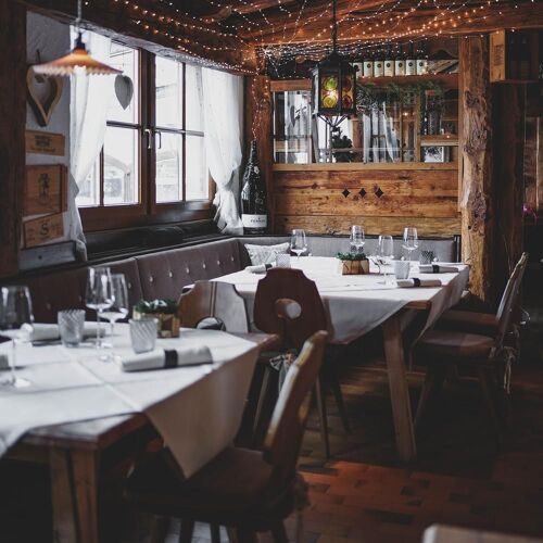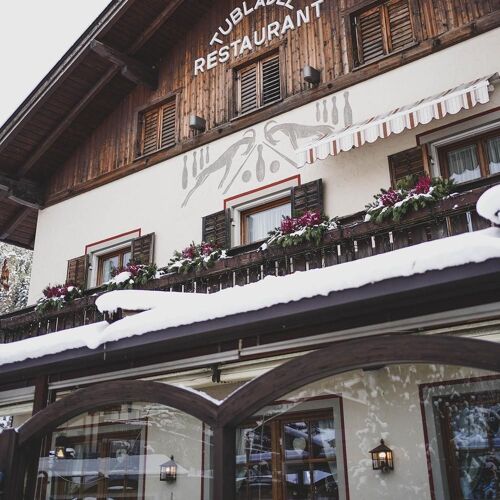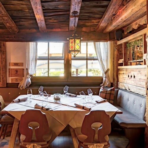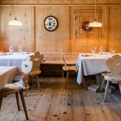 Although this restaurant with wood-adorned dining rooms has the rustic and romantic ambience of an old Alpine hut (the name “tubladel” is the Ladin for hay barn), it is actually situated just a stone’s throw from the centre of Ortisei. The cuisine focuses on local ingredients such as meat and game, with dishes such as venison pappardelle and roast pork shank on the menu, and very few fish options. Good selection of wines by the glass.