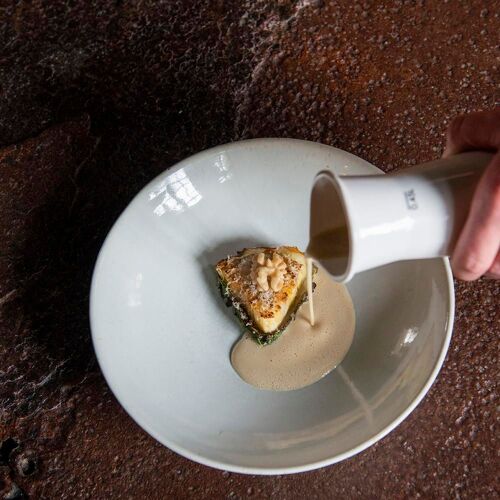 As you cross the threshold and see the red and green colour scheme of the decor, the huge fireplace and period flooring, you will fancy yourself back in 18C West Flanders. So take a seat and soak up the splendour. Emily and Bart are passionate about their work. This manifests itself in their choice of mostly local ingredients, their reinterpretations of time-honoured recipes and the finesse of their creativity. They are committed to using traditional cooking techniques as evidenced in the medium-rare duck fillet with a fine crust, accompanied by glazed vegetables and a jus de canard that incorporates the subtle bitterness of Picon. The carefully curated wine list gives exposure to smaller producers. This is cuisine with soul, bundled into a single set menu.
