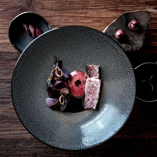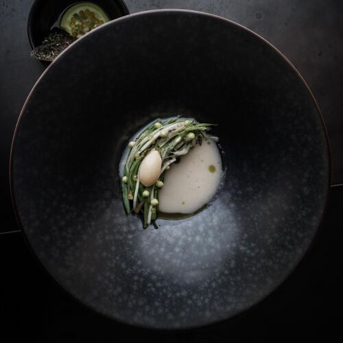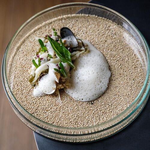 "All the materials used in the dining room come from the surrounding area: stone, iron, driftwood... No ingredient is imported: local alternatives to cocoa (roasted chestnuts and goat cheese whey), organic ikejime trout, meat from small farms bought as a whole carcass to limit waste... Any leftovers are transformed (garum, samba), dried (homemade charcuterie), or fermented (preserves, vinegars)."