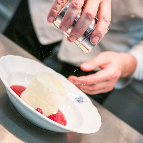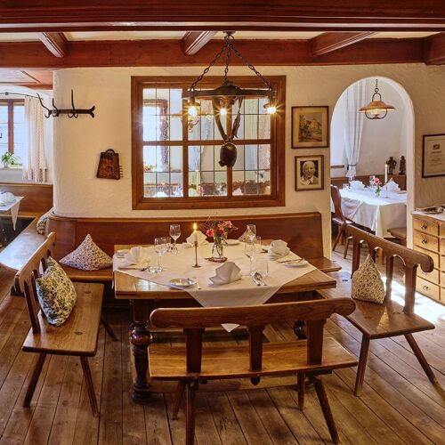 This is how you imagine a historical Bavarian restaurant: wooden beams on the ceiling, floorboards, tiled stove – rustic, inviting and wonderfully cosy (or "zünftig" as they say in these parts). There is also a wonderful terrace. The cuisine is classic, regional and seasonal – served à la carte or in three set menus, one of which is vegetarian. There is a good selection of wines to choose from. Tip: well-priced lunch menu with two or three courses (Tues. to Fri., except public holidays). You can also visit the Baroque Münster Heilig Kreuz in Bergen.