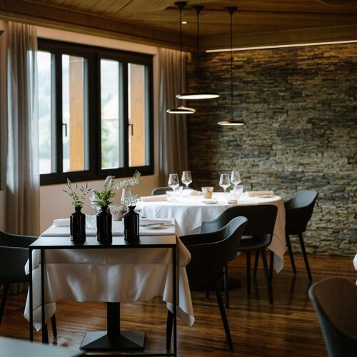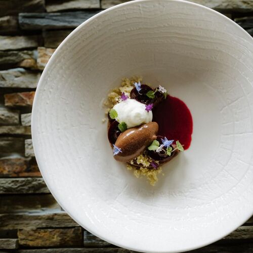 At Alpenblick two exciting dining options await: there is the lively bistro, where you can tuck into down-to-earth dishes such as steak tartare or Wiener schnitzel, or separated by a curtain is Stuba with its exceptionally ambitious fine dining menu. Comprising four to six courses, it comes in omnivore and vegetarian versions. Chef-patron Björn Inniger serves up cosmopolitan modern cuisine, sourcing many ingredients from the region. His dishes feature subtle nuances, bold contrasts, and they are packed with flavour. The timelessly elegant yet cosy setting and the enjoyably laid-back and attentive service courtesy of a charming team make for a pleasant atmosphere.